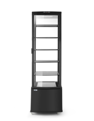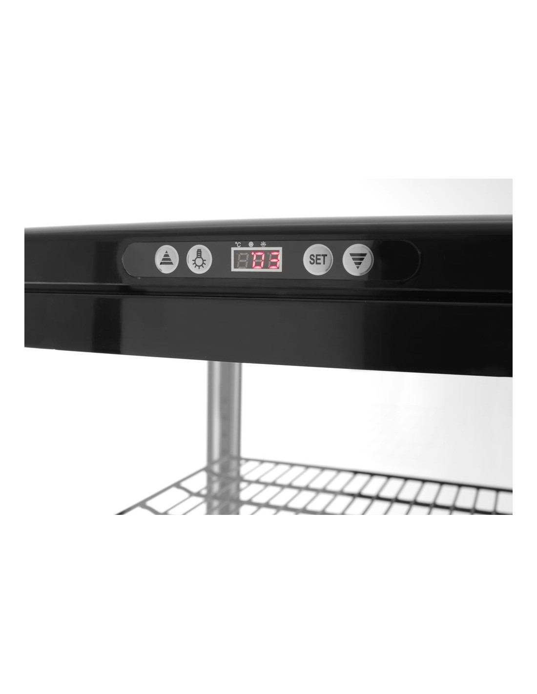 Vitrinskåpsram tillverkad av ABS+PVC-polymerer, med dubbelglas. Enhetshölje tillverkat av ABS. Forcerad kylning med automatisk avfrostning, kompressor placerad under kammaren. Luftkanal utanför glaset blåser luft över glaset för att avlägsna och förhindra kondens. Slitstarka PVC-belagda hyllplan, justerbara i höjd. Med ljusstark LED-belysning i taket. Digital temperaturregulator och display. Klimatklass: 4
