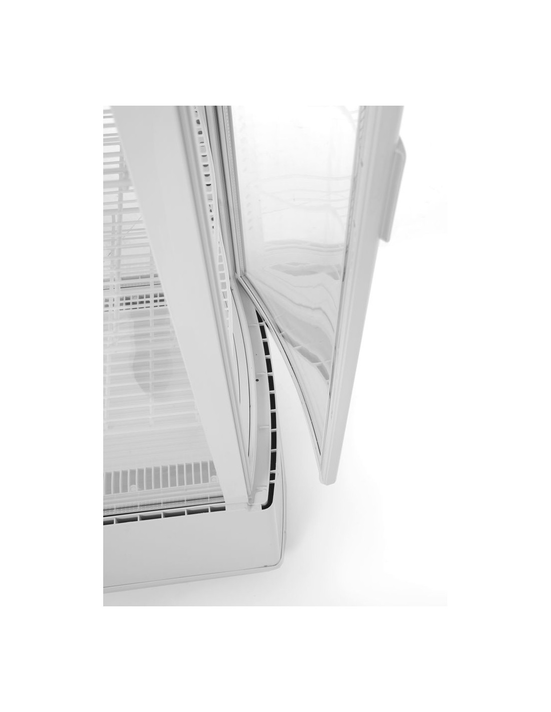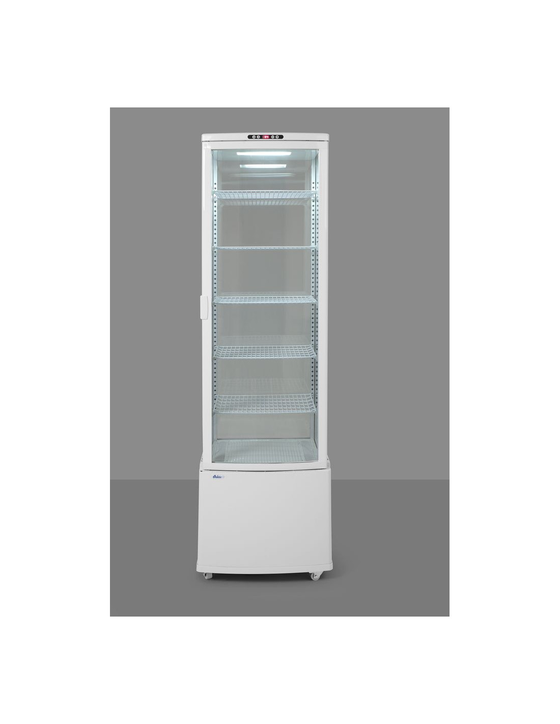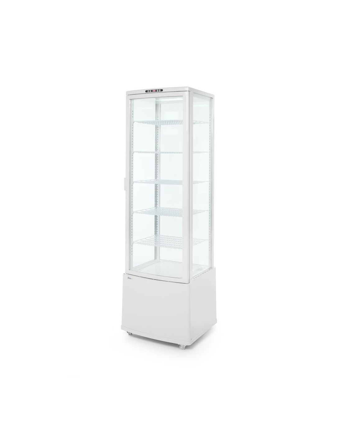 Vitrinskåpsram tillverkad av ABS+PVC-polymerer, med dubbelglas. Enhetshölje tillverkat av ABS. Forcerad kylning med automatisk avfrostning, kompressor placerad under kammaren. Luftkanal utanför glaset blåser luft över glaset för att avlägsna och förhindra kondens. Slitstarka PVC-belagda hyllplan, justerbara i höjd. Med ljusstark LED-belysning i taket. Digital temperaturregulator och display. Klimatklass: 4