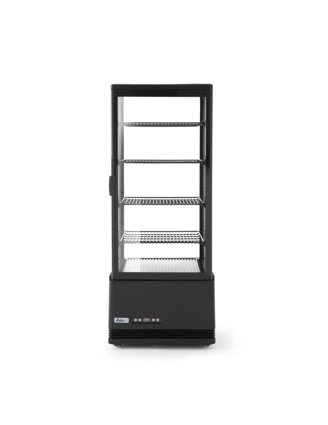 Vitrinskåpsram tillverkad av ABS+PVC-polymerer, med dubbelglas. Enhetshölje tillverkat av ABS. Forcerad kylning med automatisk avfrostning, kompressor placerad under kammaren. Luftkanal utanför glaset blåser luft över glaset för att avlägsna och förhindra kondens. Slitstarka PVC-belagda hyllplan, justerbara i höjd. Med ljusstark LED-belysning i taket. Digital temperaturregulator och display. Klimatklass: 4