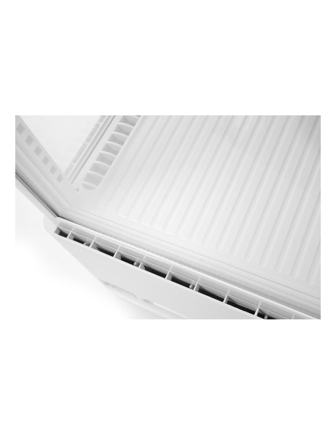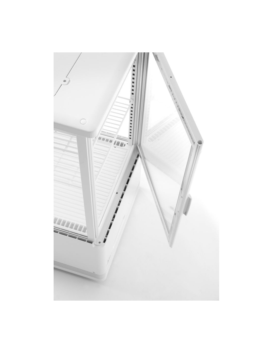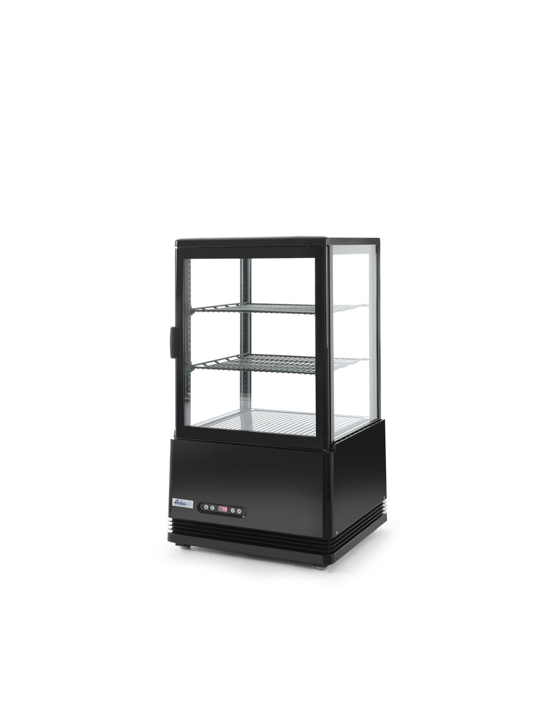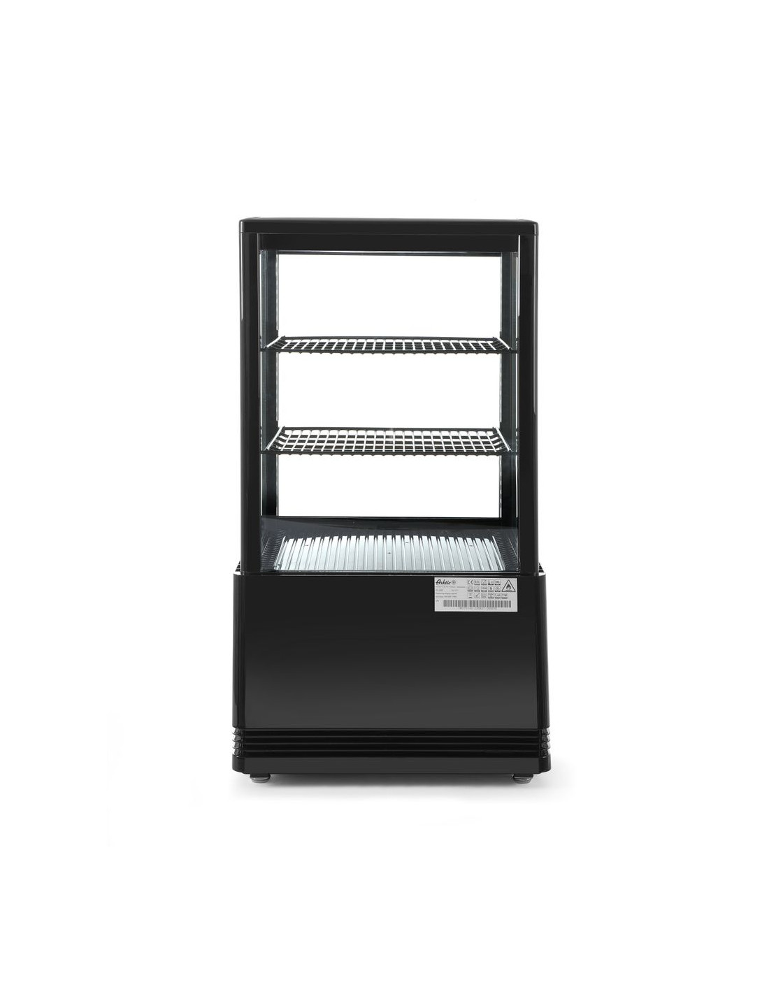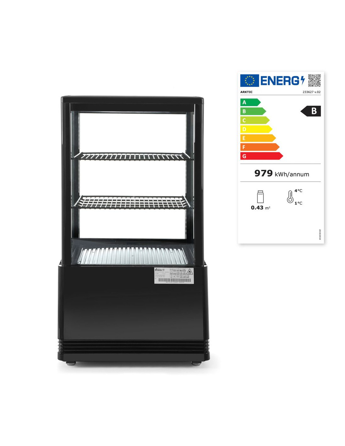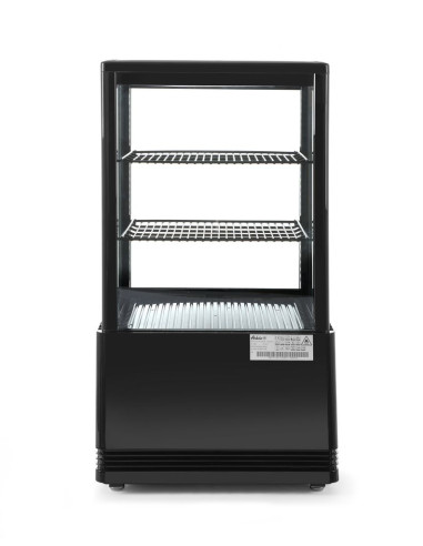 Vitrinskåpsram tillverkad av ABS+PVC-polymerer, med dubbelglas. Enhetshölje tillverkat av ABS. Forcerad kylning med automatisk avfrostning, kompressor placerad under kammaren. Luftkanal utanför glaset blåser luft över glaset för att avlägsna och förhindra kondens. Slitstarka PVC-belagda hyllplan, justerbara i höjd. Med ljusstark LED-belysning i taket. Digital temperaturregulator och display. Klimatklass: 4