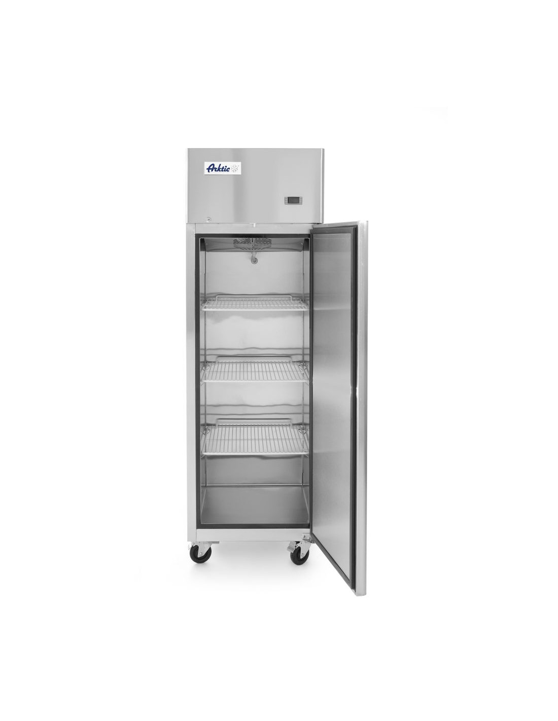 Arktic Freezer med enkeldörr ger hållbarhet och pålitlig kylning för professionella kök. Forcerad luftkylning med automatisk avfrostning säkerställer jämna temperaturer, medan den digitala displayen och den elektroniska termostaten ger exakt kontroll. Justerbara hyllor passar upp till GN 1/1-behållare, och smidig förflyttning görs enkel med fyra hjul, inklusive två länkhjul, för flexibel placering.
