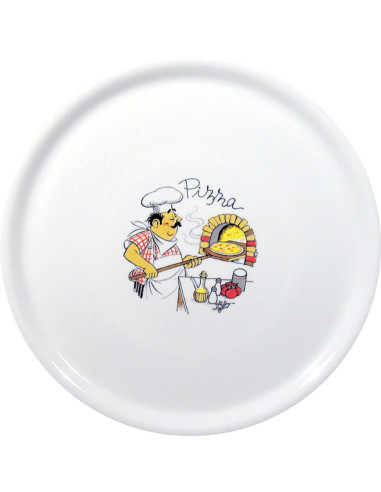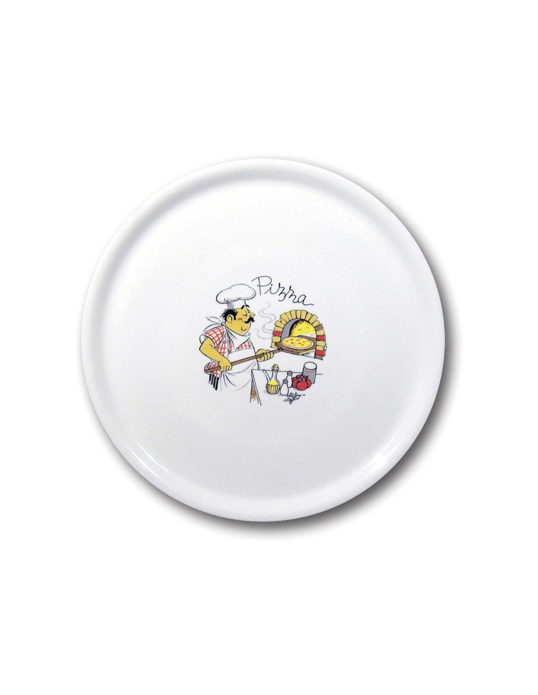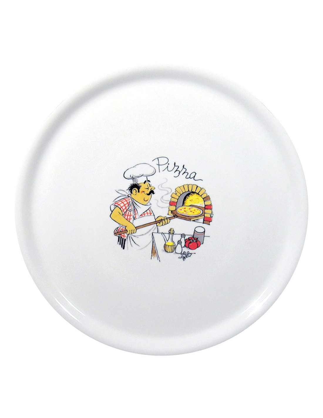 HENDI Pizzatallrik Traditional är idealisk för servering av pizza tack vare den perfekt platta formen och dess diameter. Det roliga mönstret – en bild av en pizzaiolo – gör att tallriken sticker ut bland de andra. Dekorationen sitter under glasyren vilket gör den diskmaskinssäker.