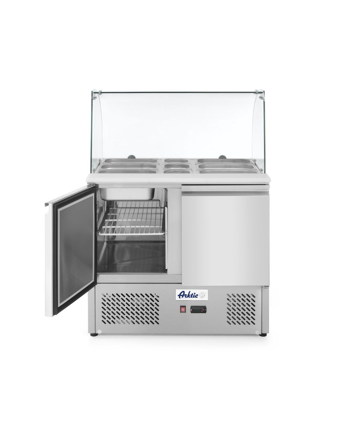 Bänkskiva försedd med praktiskt glasskydd. Bänkskivan erbjuder plats för 2x GN 1/1 och 3x GN 1/6 kantiner (maxhöjd 150 mm). Kammarmått: 830x595x(H)500 mm. 2 hyllplan (335x570 mm) ingår, bärförmåga 15 kg vardera. Bänkskivans höjd: 858 mm. Arbetsbänk i plast: 900x135x(H)20 mm. Vikt: 80 kg.