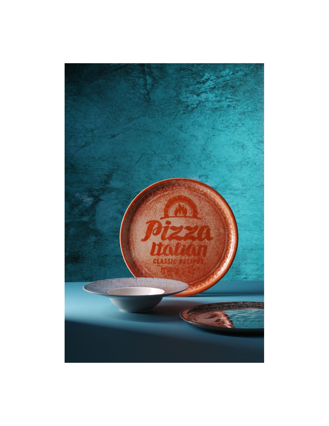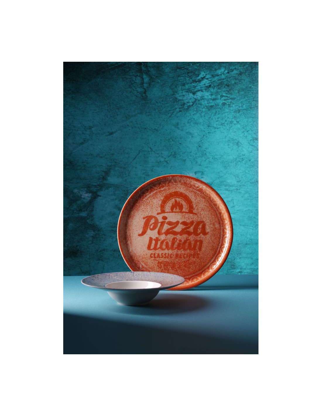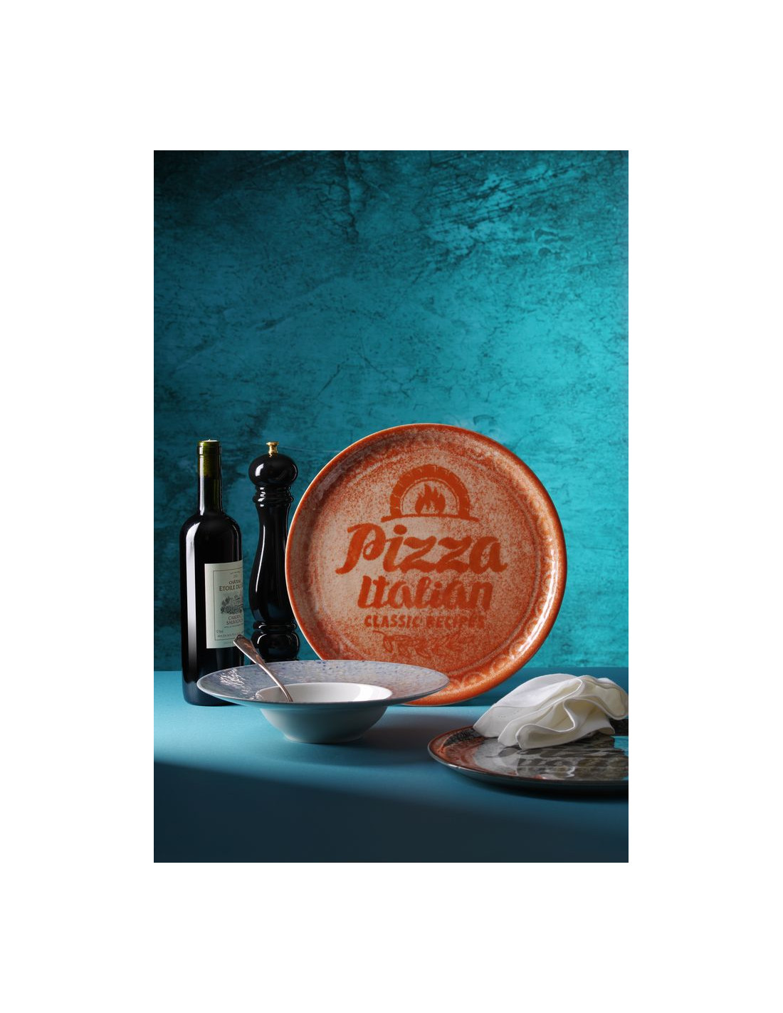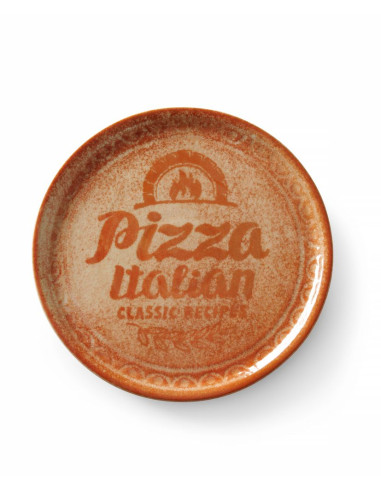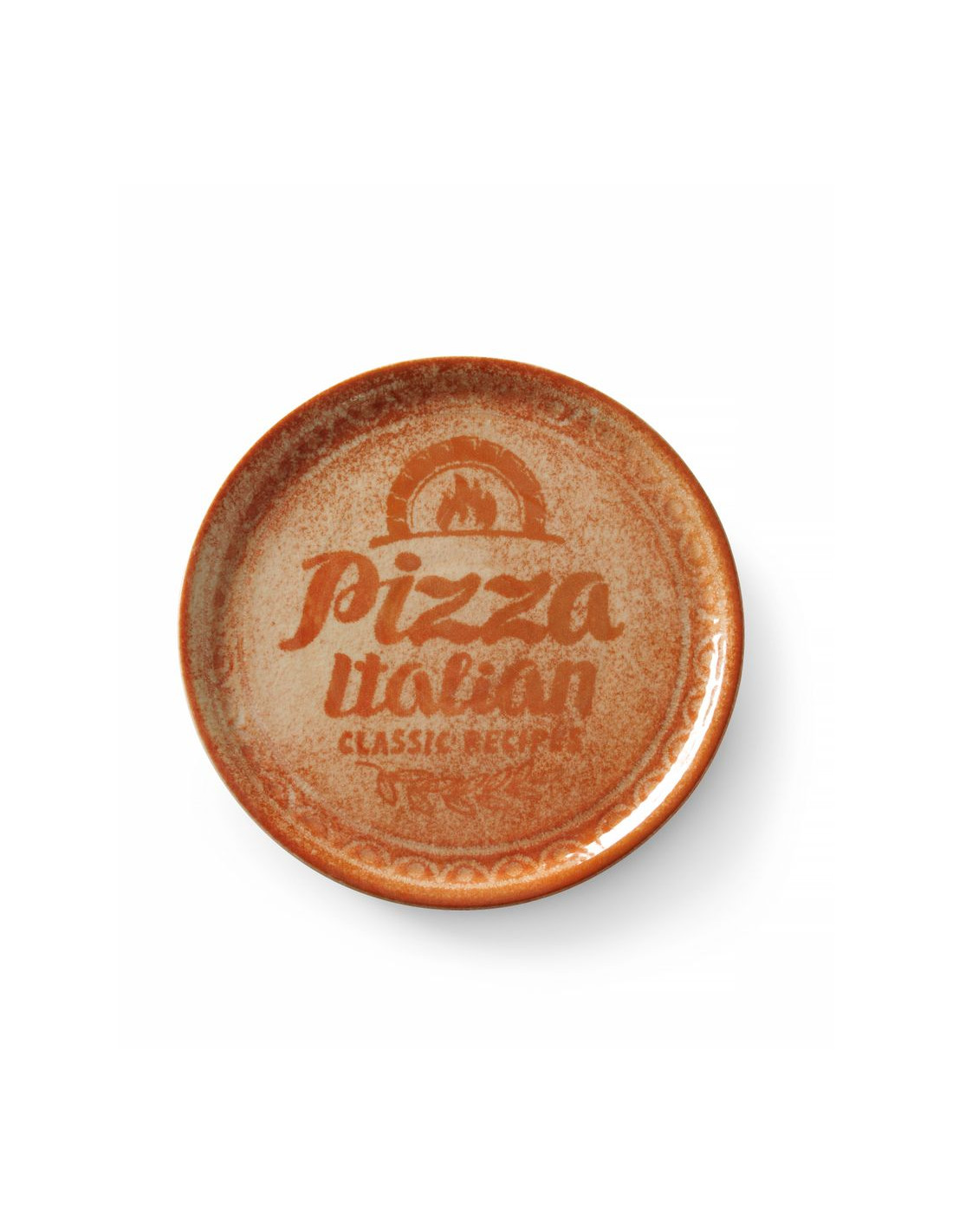 HENDI Pizzatallrik Recipe Collection Brick Red är idealisk för servering av pizza tack vare den perfekt platta formen och dess diameter. Det speciella mönstret med text och illustration av pizza på en tegelröd bakgrund gör att tallriken sticker ut. Dekorationen sitter under glasyren vilket gör den diskmaskinssäker.