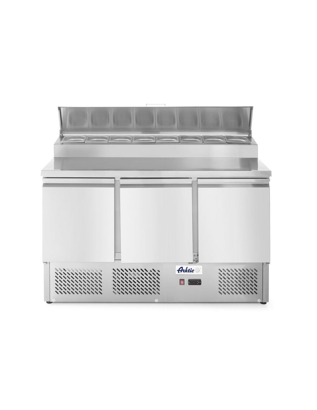 Med lock i rostfritt stål som rymmer 8x GN 1/6-behållare (maxhöjd 150 mm). Mått för behållare: 1295x595x(H)500 mm. Mått för GN-display: 1365x265x(H)195 mm. 3 hyllplan (335x570 mm) ingår. Bärförmåga 15 kg vardera. Höjd på arbetsytan: 858 mm. Vikt: 105 kg