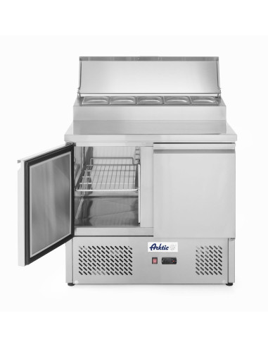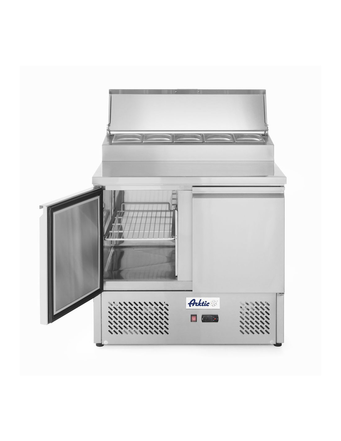 Med lock i rostfritt stål som rymmer 5x GN 1/6-behållare (maxhöjd 150 mm). Mått för behållare: 830x595x(H)500 mm. Mått för GN-display: 900x265x(H)195 mm. 2 hyllplan (335x570 mm) ingår. Bärförmåga 15 kg vardera. Höjd på arbetsytan: 858 mm. Vikt: 75 kg