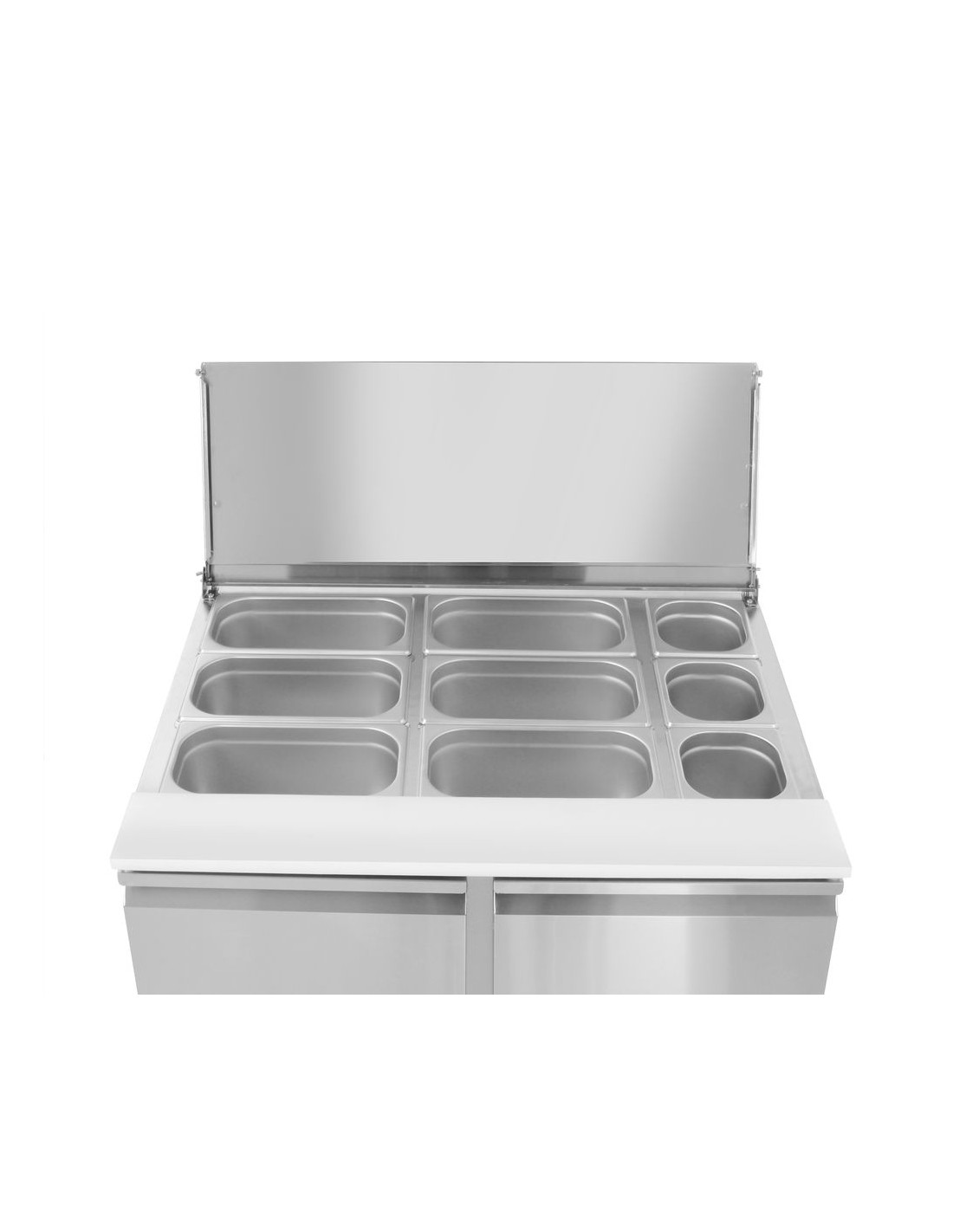 Med lock i rostfritt stål som rymmer 2x GN 1/1 och 3x GN 1/6 kantiner (maxhöjd 150 mm). Kammarmått: 830x595x(H)500 mm. 2 hyllplan (335x570 mm) ingår. Bred belastningskapacitet på 15 kg vardera. Arbetsbänk i plast: 900x135x(H)20 mm. Vikt: 68 kg.