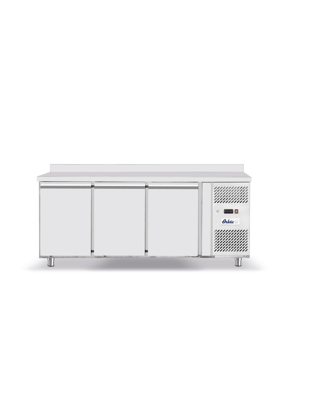 Arktic kyldisk med 3 dörrar erbjuder en robust och lättstädad lösning. Enheten har forcerad luftkylning med automatisk avfrostning, vilket säkerställer jämn temperaturkontroll, och är utrustad med en digital display och elektronisk termostat för exakt övervakning. Dess justerbara hyllor och möjligheten att rymma GN 1/1-behållare gör den mycket mångsidig, medan den 50 mm tjocka polyuretanskumisoleringen optimerar energieffektiviteten.