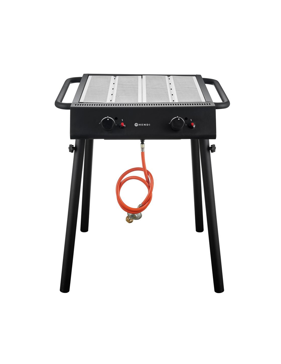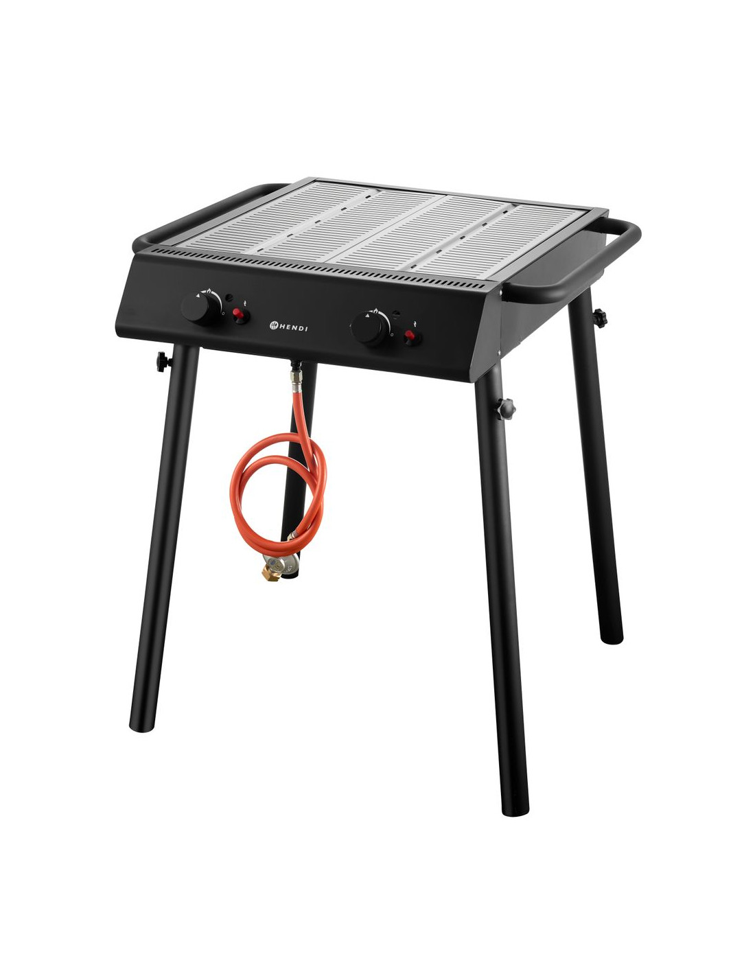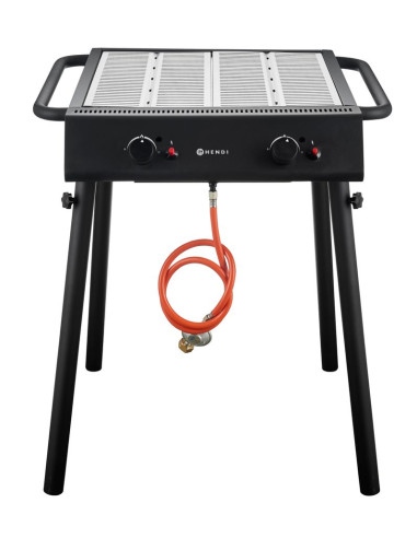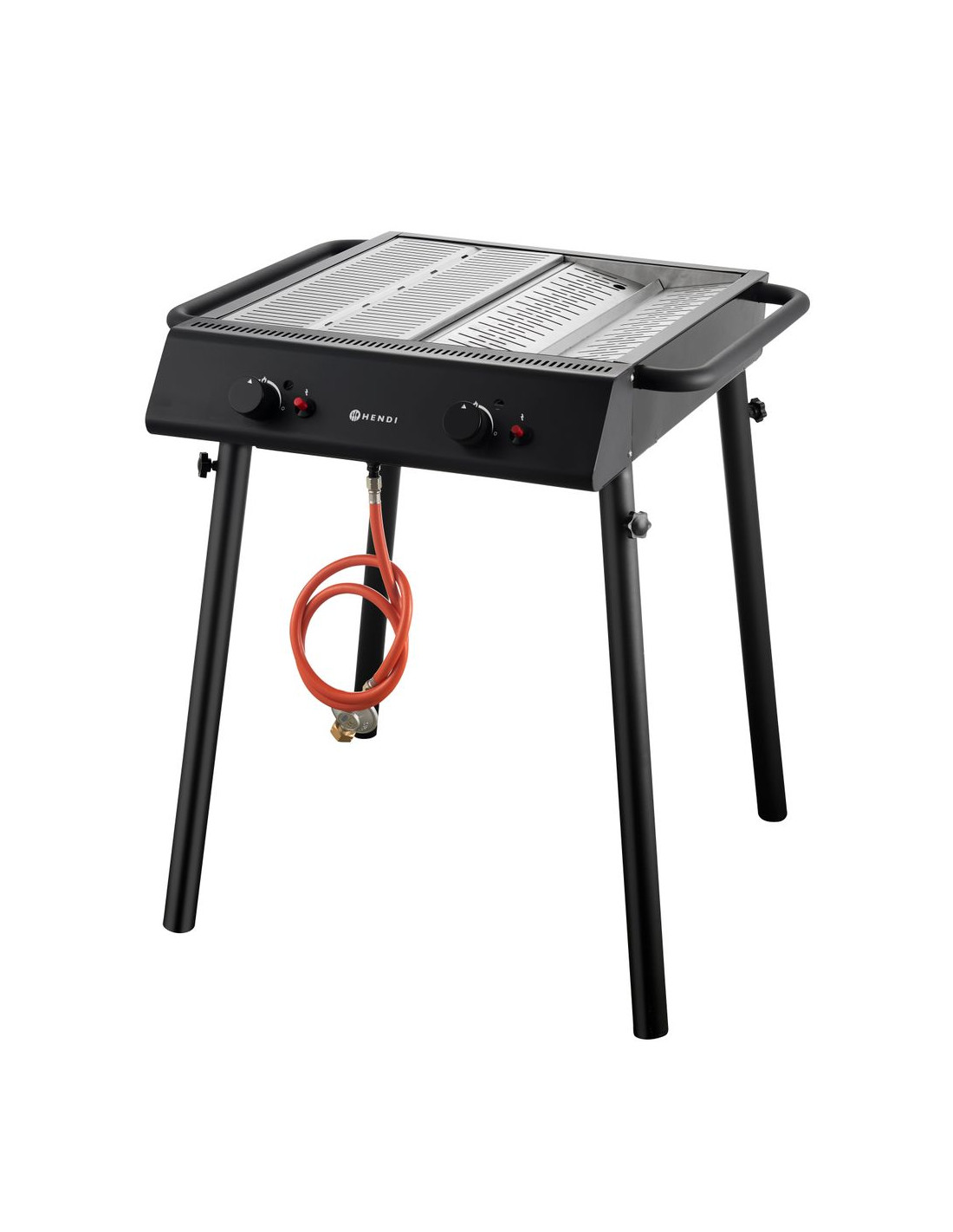 Denna grill i rostfritt stål har fyra avtagbara ben som kan packas platt till en kompakt enhet för transport. Brännarna utvecklar en hög temperatur i den vindtäta enheten och därför är denna grill lämplig för storskalig produktion. Själva enheten är lätt att rengöra tack vare dessa höga temperaturer. De två brännarna kan användas oberoende av varandra. Utrustad med termoelement och elektronisk tändning, gasslang och tryckregulator ingår. Lämplig för propangas. Galleryta 540x540 mm (2 galler på 540x270 mm). Brännarnas huvudhölje är svart emaljerat. Frontpanel och ben är pulverlackerade i svart.