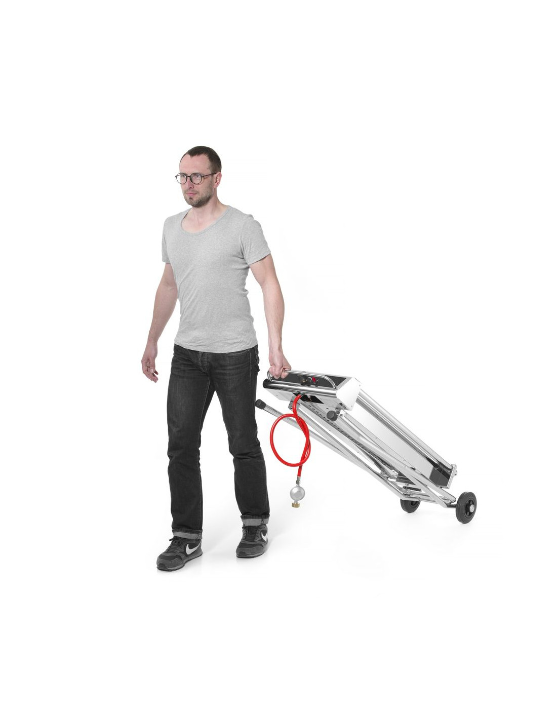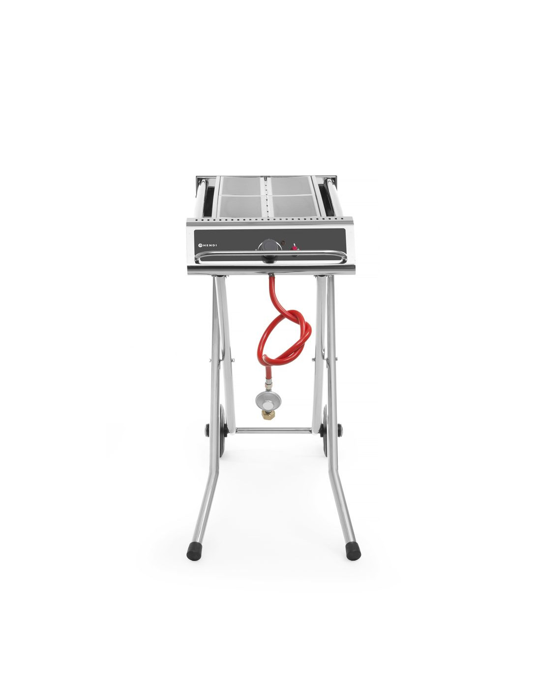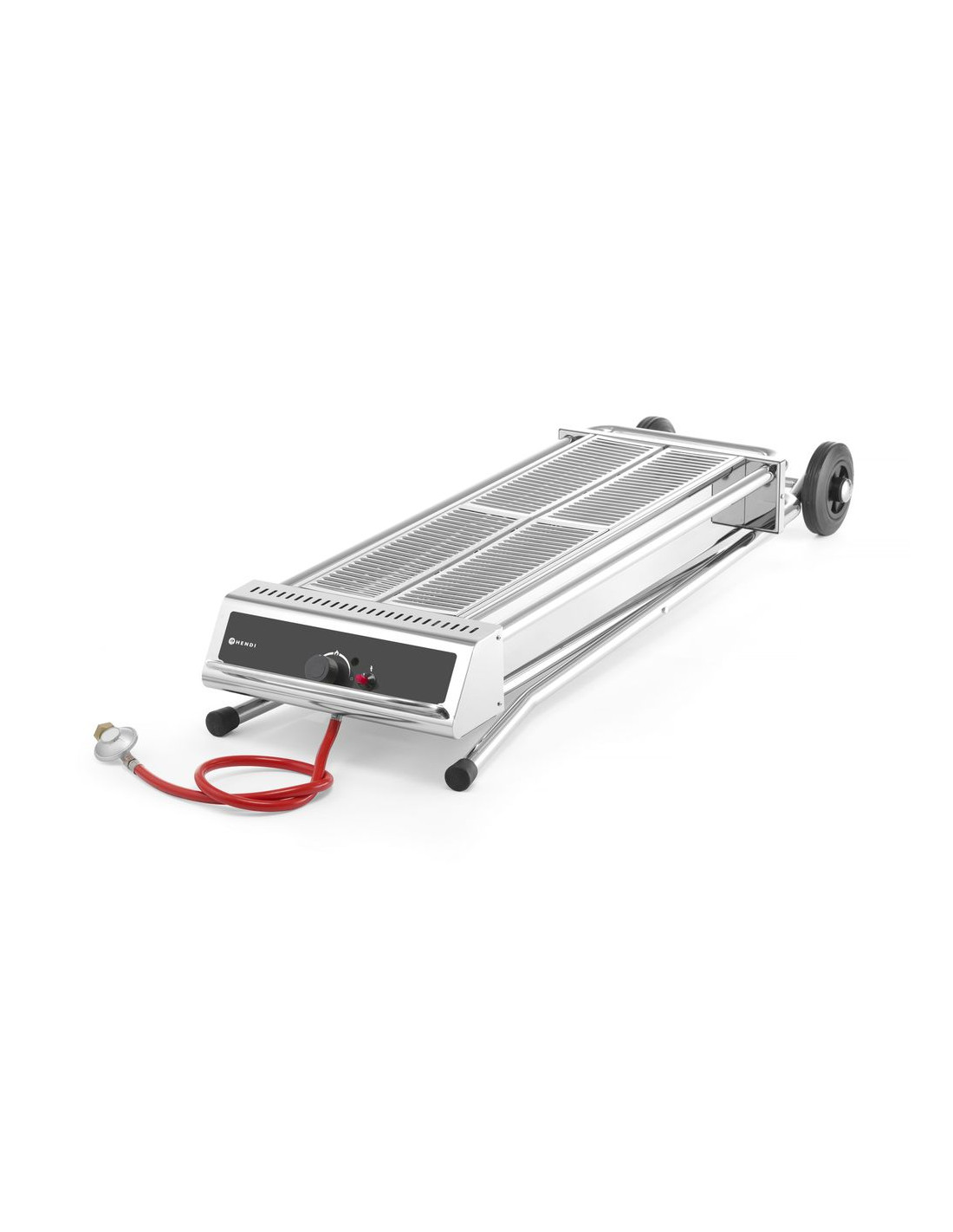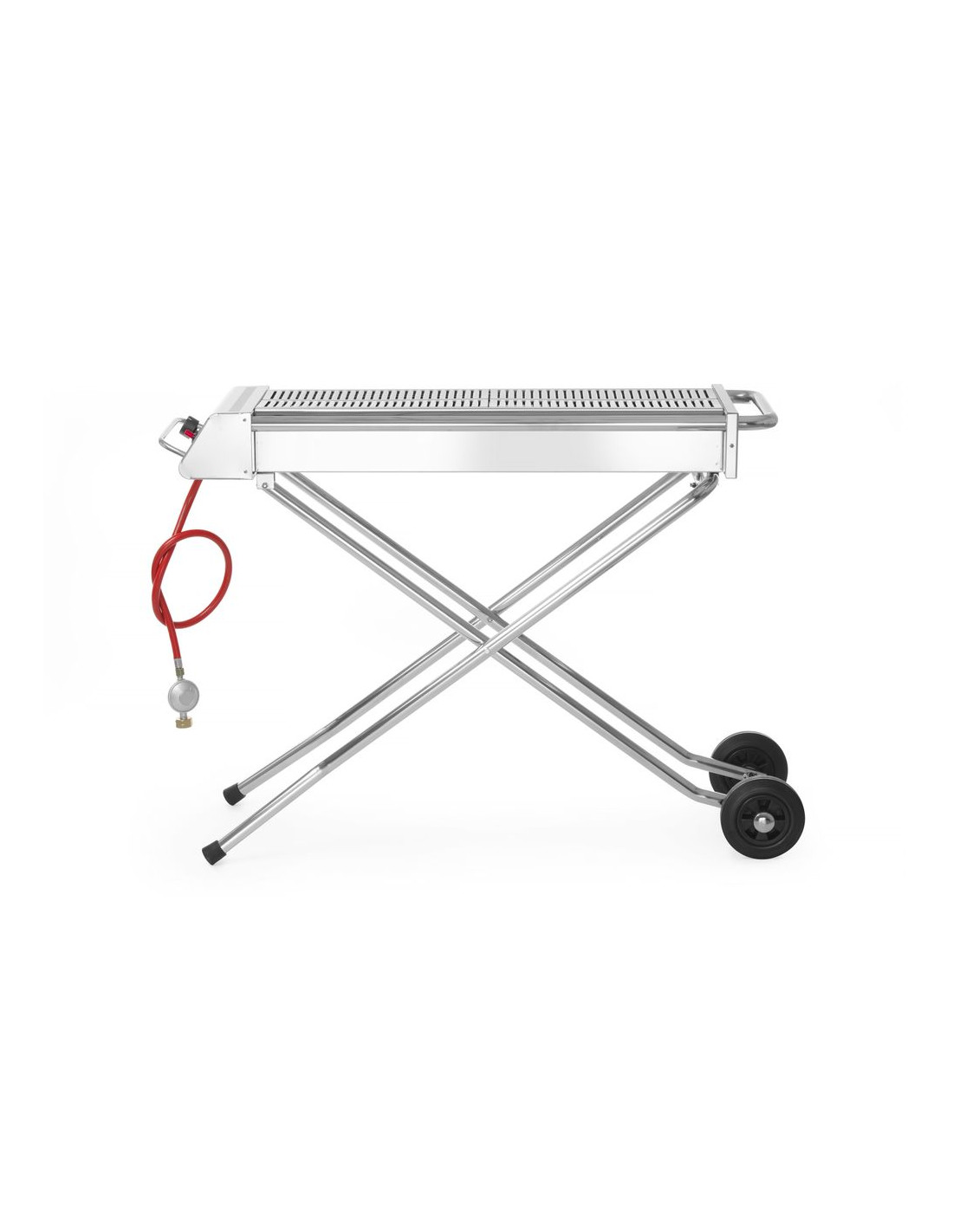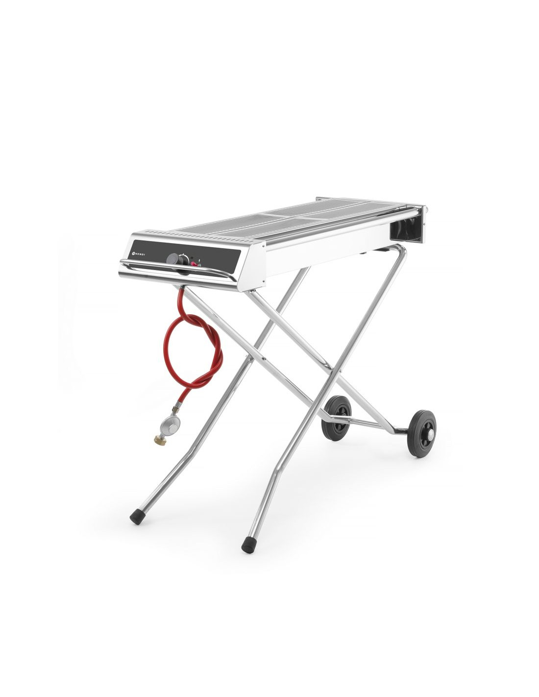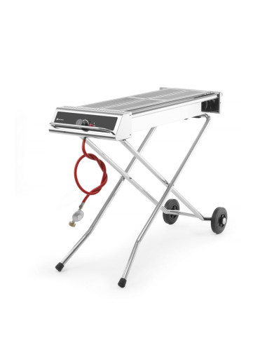 Denna rostfria grill med hopfällbar bas är enkel att flytta tack vare sina hjul och kan plattpackas till en kompakt enhet under transport. Brännaren utvecklar en hög temperatur i den vindtäta enheten och därför är denna grill lämplig för storskalig produktion. Själva enheten är lätt att rengöra tack vare dessa höga temperaturer. Grillen är utrustad med ett termoelement och elektronisk tändning, gasslang och tryckregulator ingår. Lämplig för propangas. Galleryta 860x260 mm (2 galler på 430x260 mm). Hopfällbar och mobil bas. Gasslang, elektronisk tändning och tryckregulator ingår. Förbrukning 536 g/h.