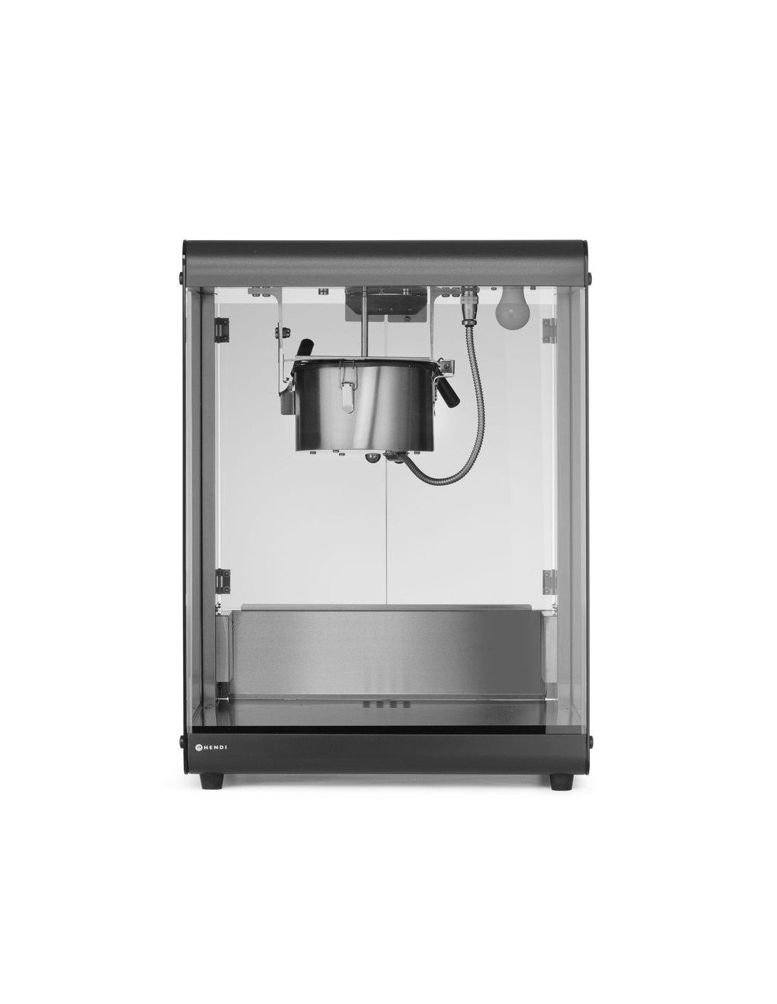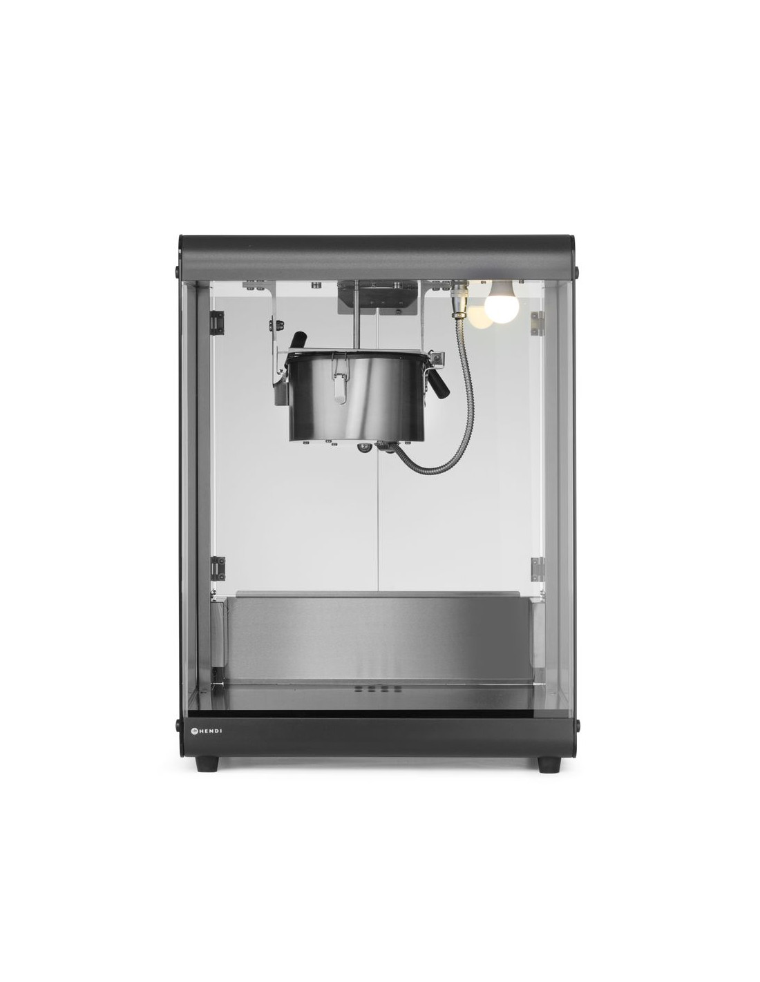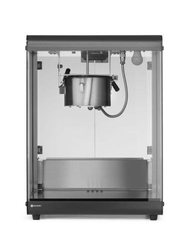 HENDI popcornmaskin har en ram i kolstål och ett hölje i härdat glas, vilket ger styrka, hållbarhet och tydlig sikt. Den inkluderar en popcornvärmepanna med omrörningsenhet för jämn poppning, en uppvärmd botten för att bibehålla värmen och en upplyst interiör för att förbättra presentationen. Praktiska tillägg som en gångjärnsförsedd servicelucka i härdat glas, popcornuppsamlingsflik och smullåda stöder effektiv och hygienisk drift.