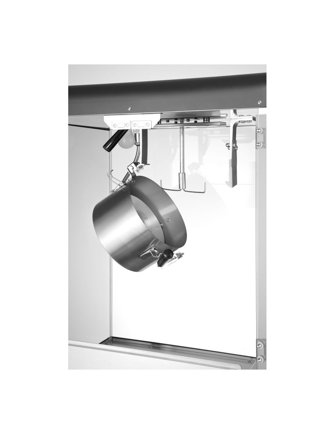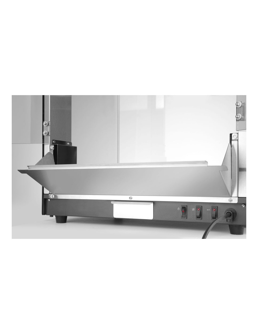 Hölje av kolstål. Gångjärnsförsedd servicelucka av härdat glas. Burk av gjuten aluminium. Inkluderar en skopa av PC. Popcornvärmepanna med omrörningsenhet. Lock med handtag av icke-värmande material. Popcornskopflik. Smullåda under kammaren för bortskaffande av opoppade kärnor och smulor. Belyst insida. Uppvärmd botten av popcornkammaren. Cykeltid: ≤ 3,5 min. – 150 g majskorn per cykel