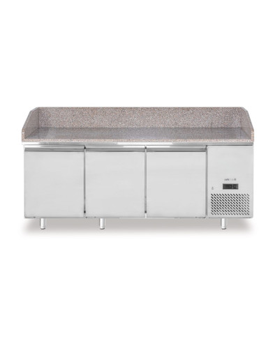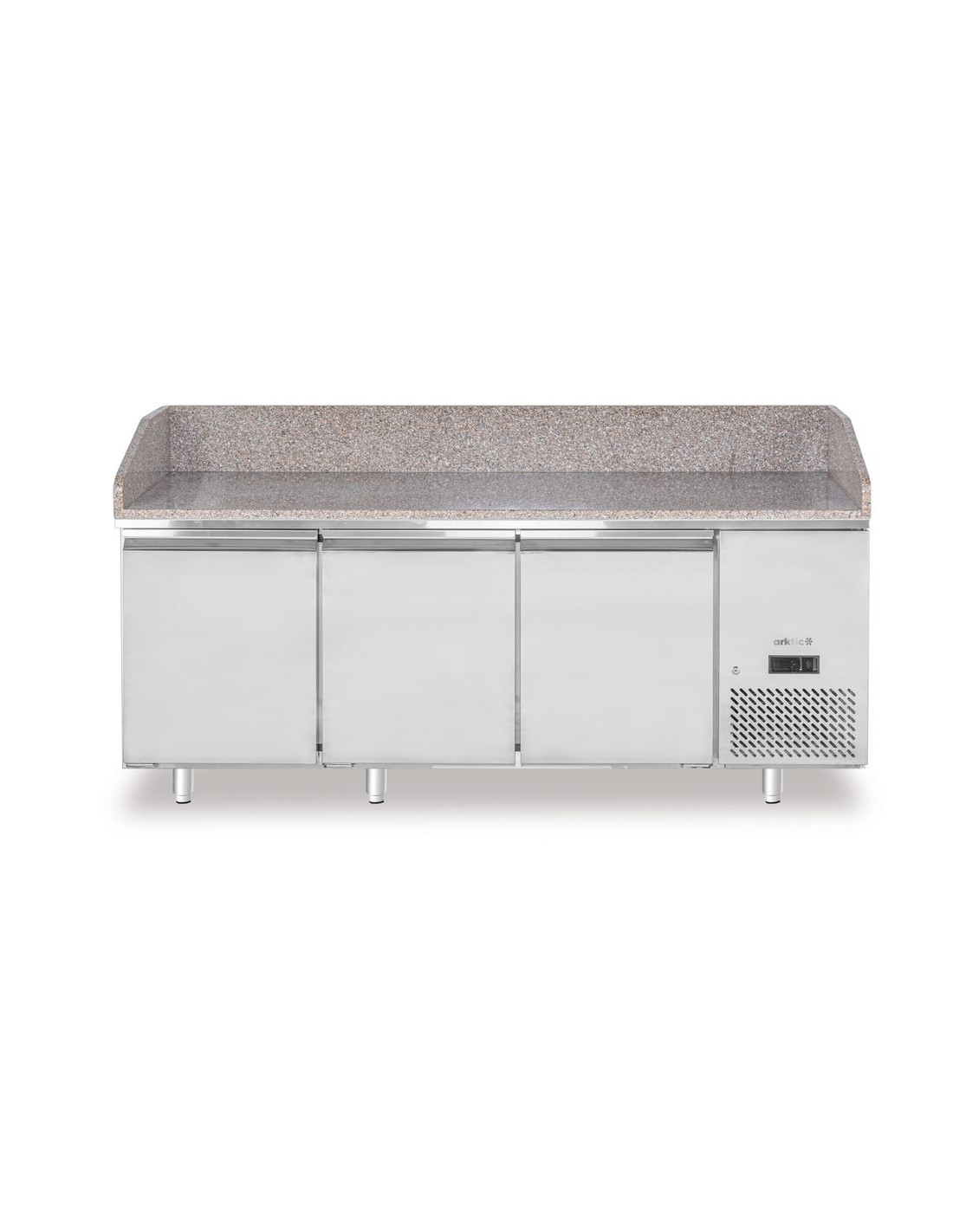 Arktic Pizza-kylbord med granitbänkskiva, 3 dörrar, är tillverkat av högkvalitativt rostfritt stål med en polerad granityta, perfekt för storkök med hög belastning. Det har forcerad luftkylning med automatisk avfrostning, digitala kontroller, justerbara GN 1/1-hyllor och effektiv polyuretanskumisolering.