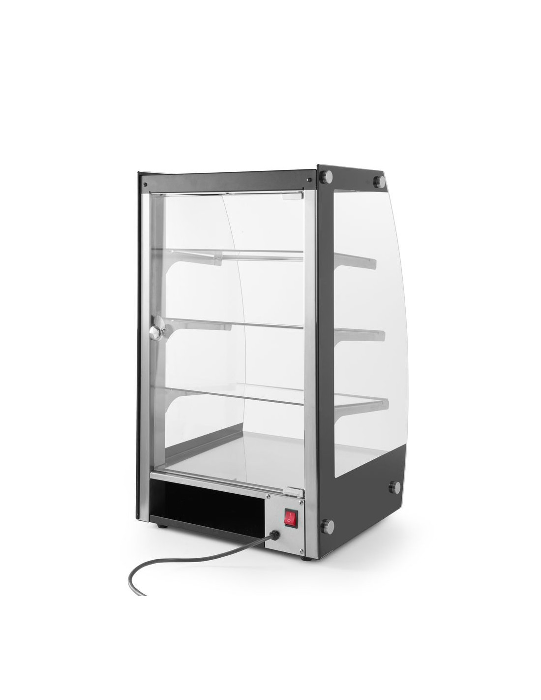 Hölje av rostfritt stål med härdat säkerhetsglas. Kammarkapacitet: 75 l. Med LED-belysning upptill med på/av-brytare. Utrustad med 3 justerbara glashyllor, 8 hyllplan tillgängliga med 45 mm mellanrum. Svartmålad stålbotten med glasskydd: 390x325 mm. Nedre glashylla: 365x250 mm. Mittenglashylla: 365x230 mm. Övre glashylla: 360x195 mm. Svartmålad ståltoppen på vitrinskåpet: 393x325 mm. 5 mm tjockt sidoglas. Saknar frontglas för självbetjäning. Magnetisk, högerhängd bakre glasdörr, öppnas endast åt ena sidan. Praktisk bottenursparning 260x320x(H)85 mm för förvaring av varor. 4 ej justerbara gummifötter: 15 mm höga.