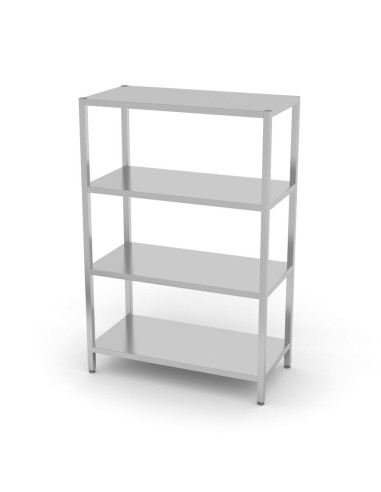 Tillverkad av rostfritt stål AISI 430. Ben av 30x30 mm profiler. Ungefärlig tillåten hyllbelastning: 70 kg/m². Justerbara fötter i intervallet: +25/-5 mm.