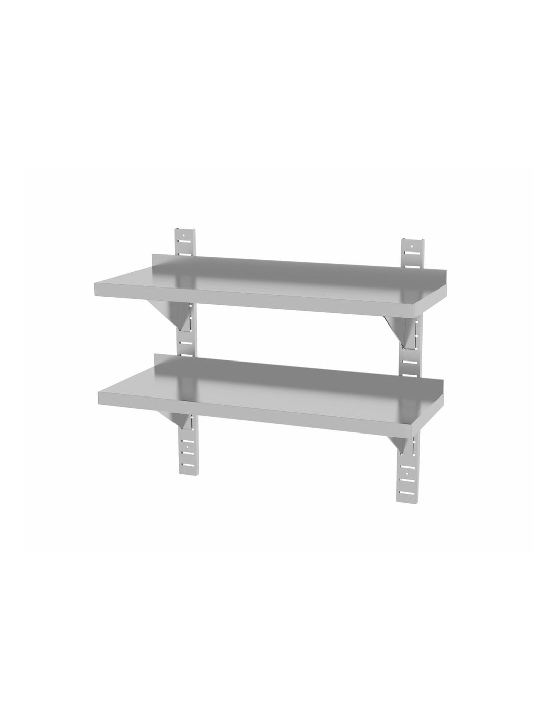 Tillverkad av rostfritt stål. Stänkskydd 30 mm högt för att skydda varorna från att falla av hyllan. Den ungefärliga tillåtna belastningen på hyllan är 25 kg/m². Setet innehåller 2 konsoler för upphängning på väggen.