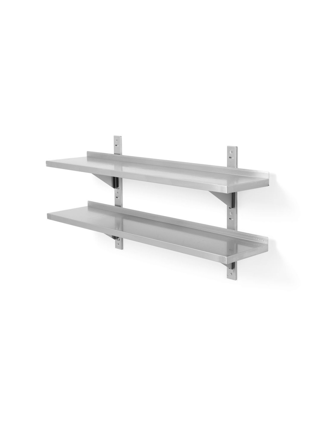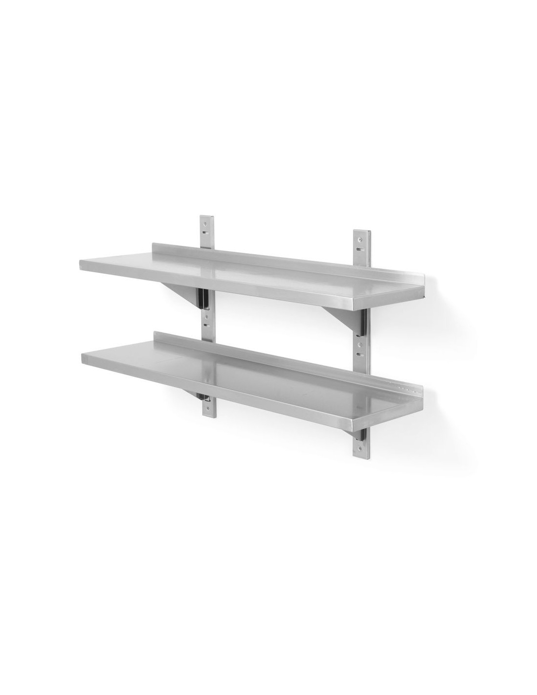 Tillverkad av rostfritt stål. Stänkskydd 30 mm högt för att skydda varorna från att falla av hyllan. Den ungefärliga tillåtna belastningen på hyllan är 25 kg/m². Setet innehåller 2 konsoler för upphängning på väggen.