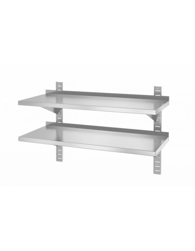 Svetsad konstruktion garanterar hållbarhet och stabilitet. Tillverkad av rostfritt stål. Stänkskydd 30 mm högt för att skydda varorna från att falla av hyllan. Möjlighet till demontering och hyllornas släta yta gör dem enkla att rengöra. Ungefärlig tillåten belastning på hyllorna är 25 kg/m². Setet innehåller 2 konsoler för upphängning på väggen.