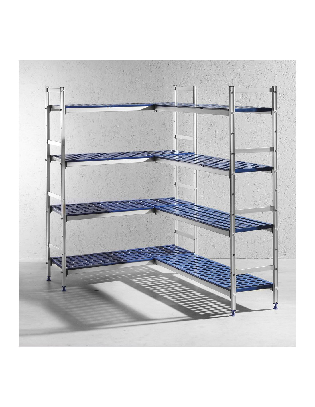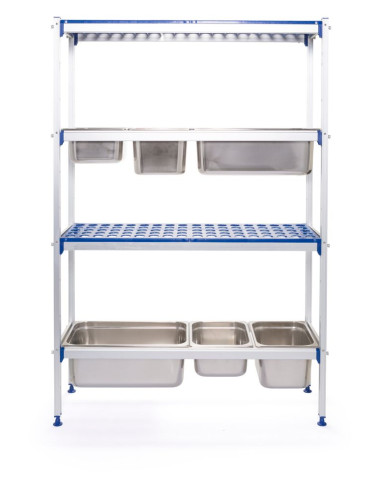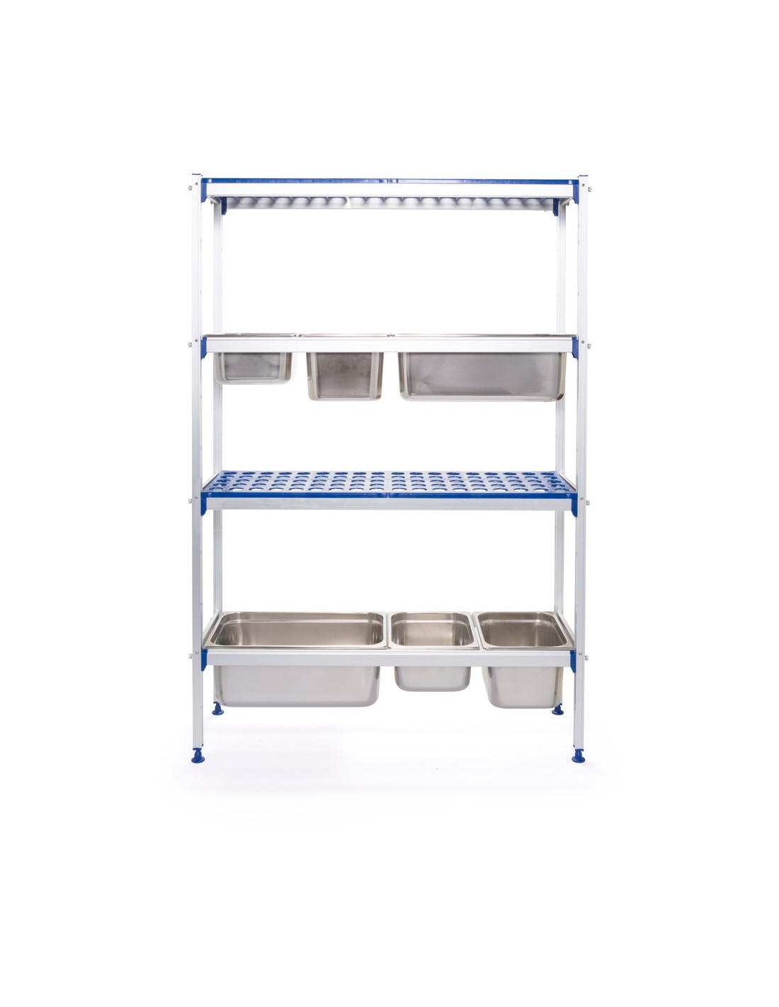 GN 1/1-behållare passar direkt mellan aluminiumstöden. Anodiserad aluminiumram. Med diskmaskinssäkra polypropenhyllor. Lätt utbyggbara. Bärförmåga 150 kg, fördelad över ytan.