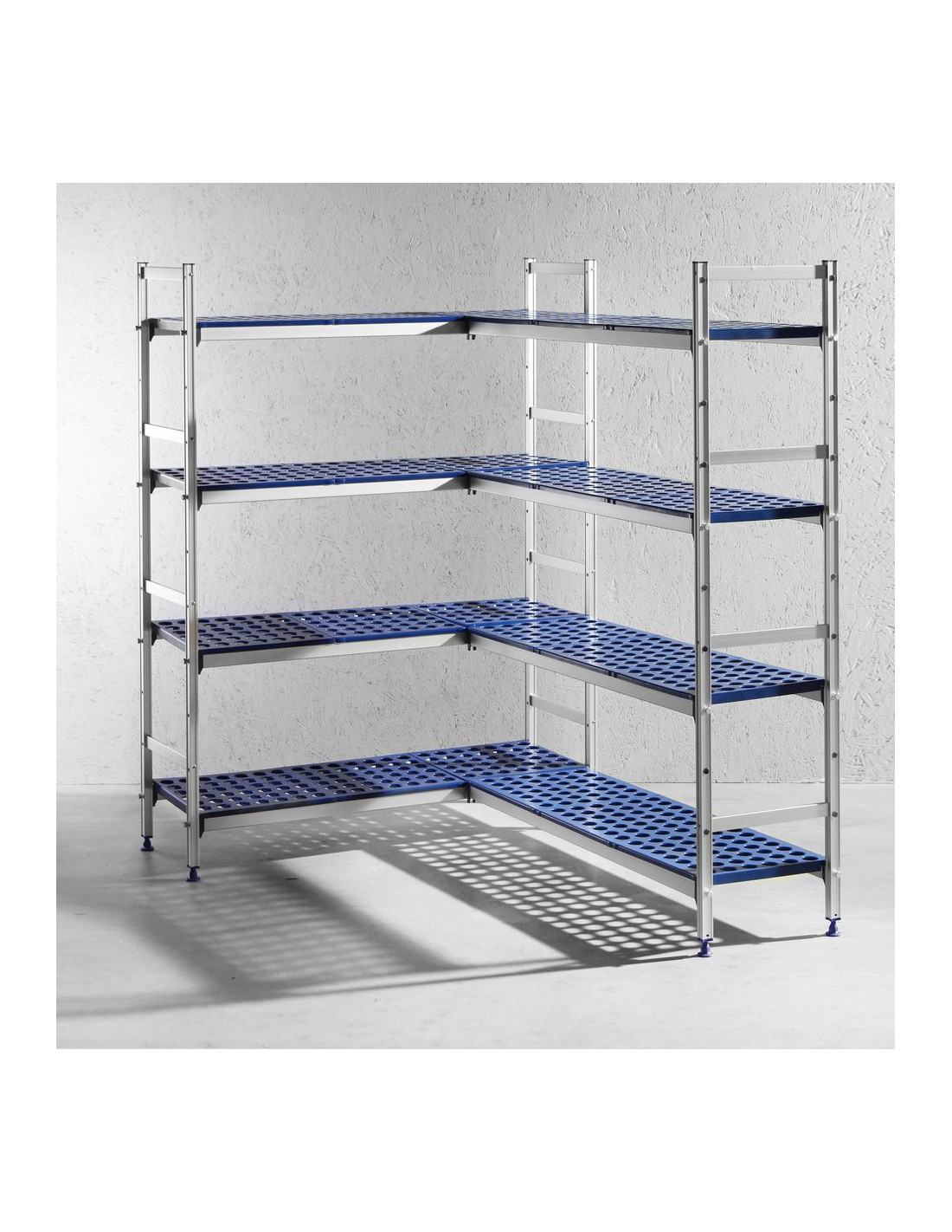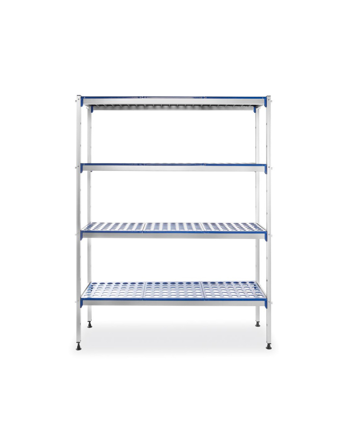 Stomme tillverkad av korrosionsbeständig anodiserad aluminium. Med 4 hyllplan består varje hyllplan av 3 avtagbara polypropenelement som tål maskindisk. Justerbara fötter för att säkerställa jämn placering. Koppla ihop hyllorna med varandra eller skapa hörnhyllor med kopplingskroken som finns i sortimentet (kod: 812280). Max. breddlastkapacitet per hyllplan: 150 kg.