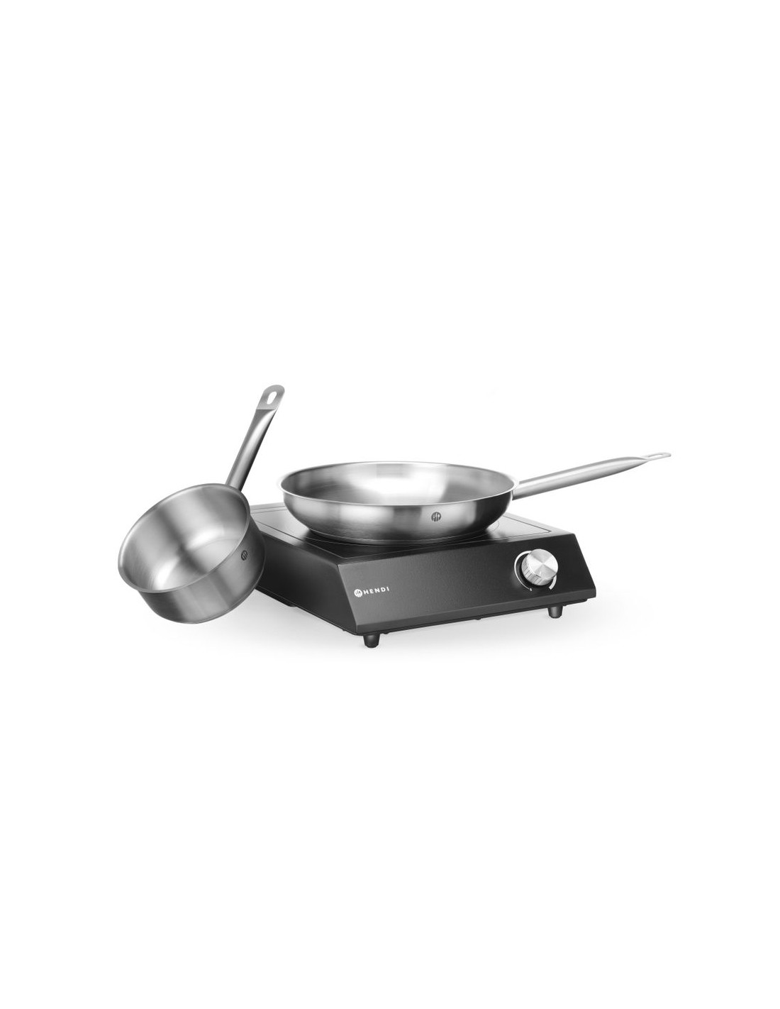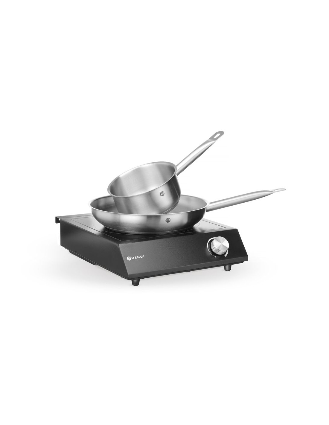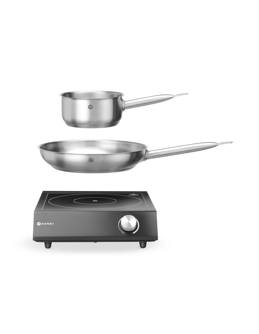 HENDI-setet: Induktionsspis 3500W + kastrull + stekpanna lovar utmärkta och snabba resultat samtidigt som det är energieffektivt. Denna induktionsspis erbjuder uppvärmning i en kompakt och elegant design, då dess kokyta är tillverkad av glas och dess hölje av pulverlackerat stål, vilket garanterar hållbarhet och elegans. Setet innehåller en kastrull och en stekpanna vilket gör detta set till det kompletta och praktiska startsetet för varje kök.