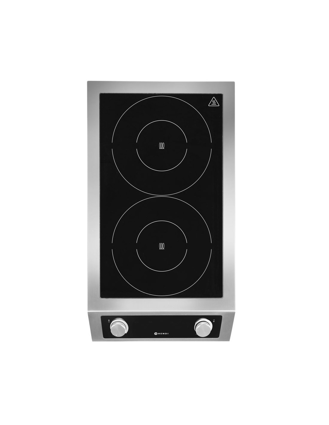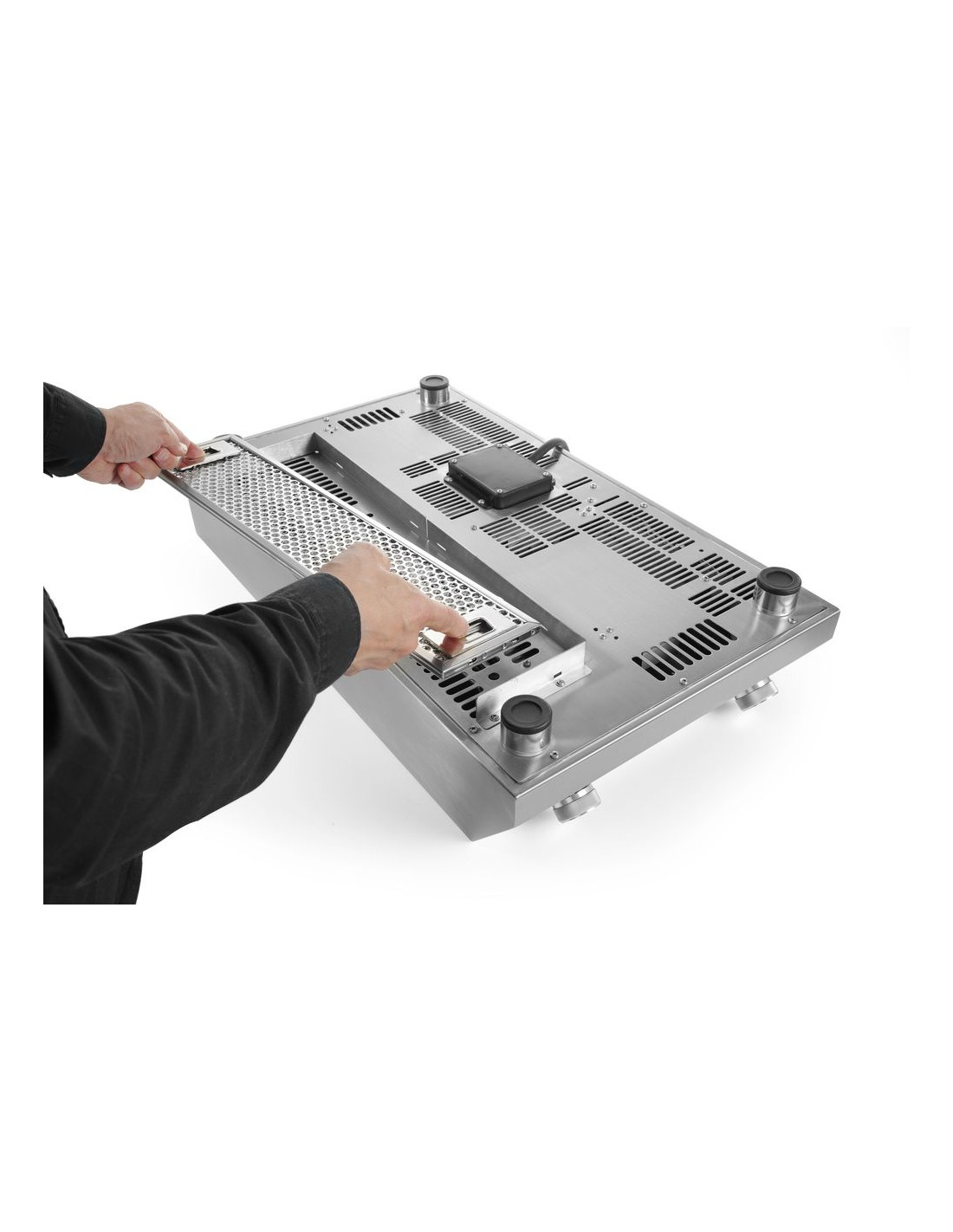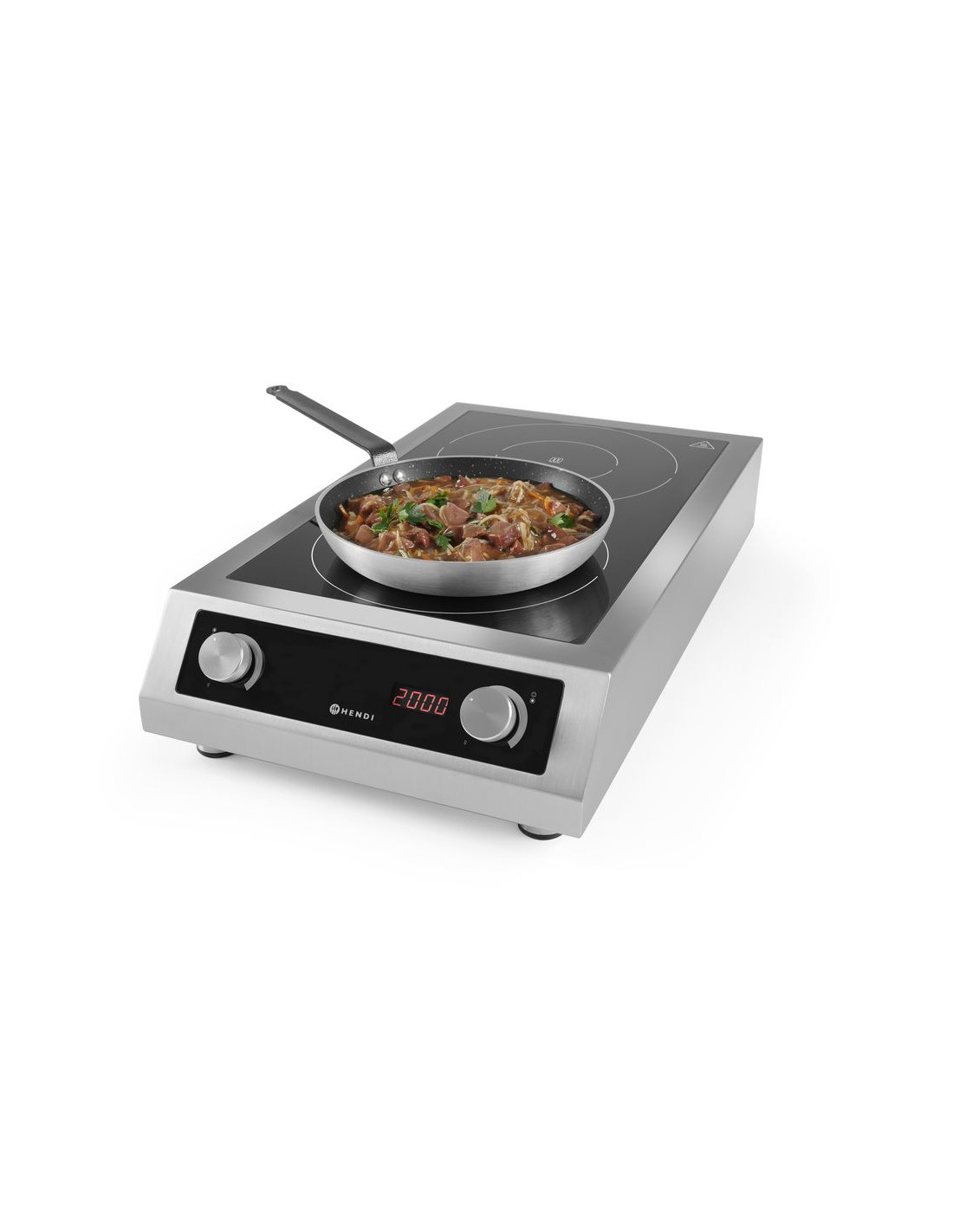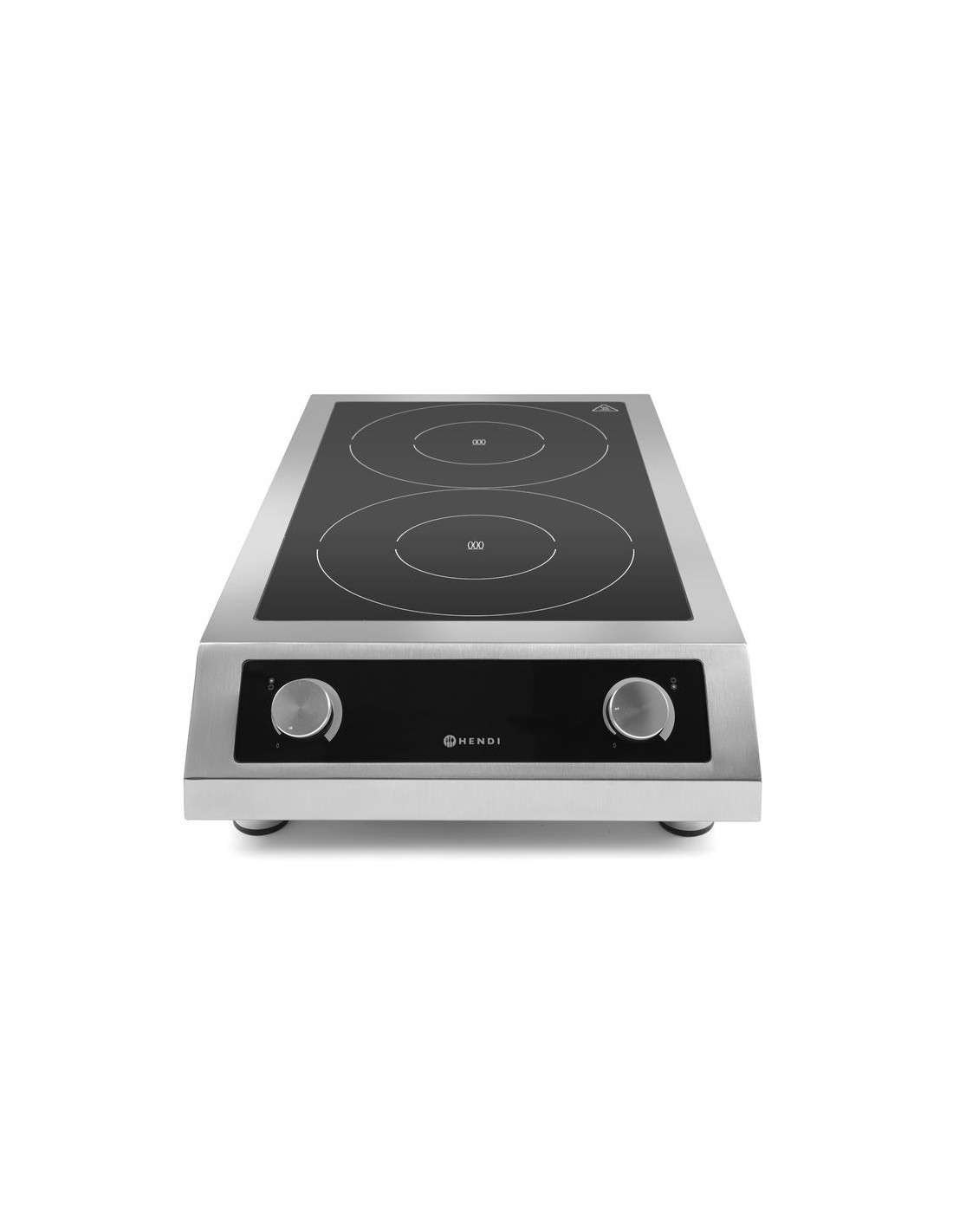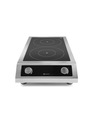 Rostfritt stålhölje med två spishällar. Den främre hällen har en maximal effekt på 5000 W, när den främre effekten är 5000 W kan den bakre hällen endast generera 2000 W. Den bakre hällen har en maximal effekt på 3500 W medan den främre hällen inte överstiger 3500 W. Elektroniskt skydd mot överhettning. Med justerbara metallfötter och avtagbart luftfilter. Fungerar med 380 V, levereras utan kontakt, en elektriker krävs för installationen. Lämplig för kastruller med bottendiameter mellan 140 och 280 mm. Maximal belastning på induktionshällen: 20+20 kg.