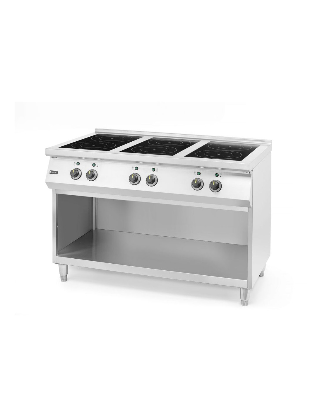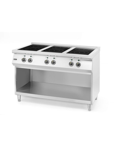 Hölje av rostfritt stål, förstärkt med ram. Induktionsyta i matt härdat glas. 6 oberoende vred med 11 effektnivåer, var och en. Maximal tillåten belastning på spishällen: 150 kg. 3x3,5 kW hällar. 3x5 kW hällar. Justerbara fötter: ≤30 mm. Lämplig för grytor och stekpannor med en bottendiameter upp till 260 mm. Extra hyllplan för förvaring. Har ett fettfilter som är lätt att ta bort och rengöra. Enheten levereras inte med stickkontakt. Varning: Enheten måste anslutas till elnätet av en elektriker.