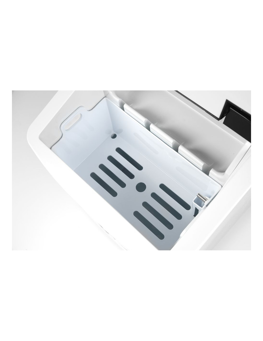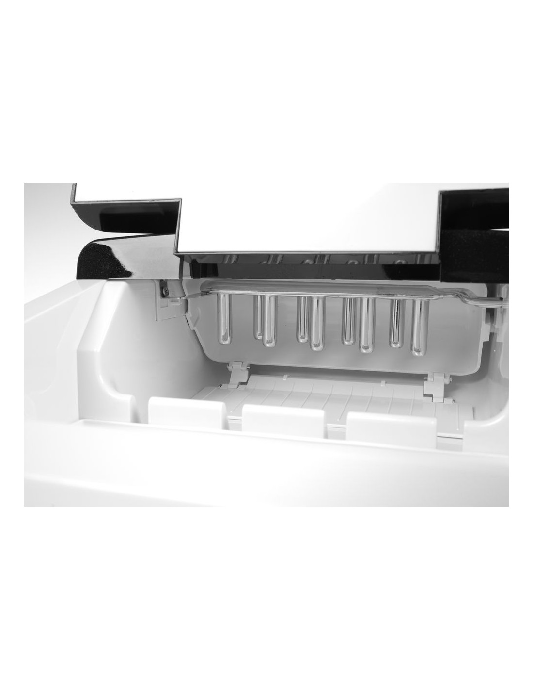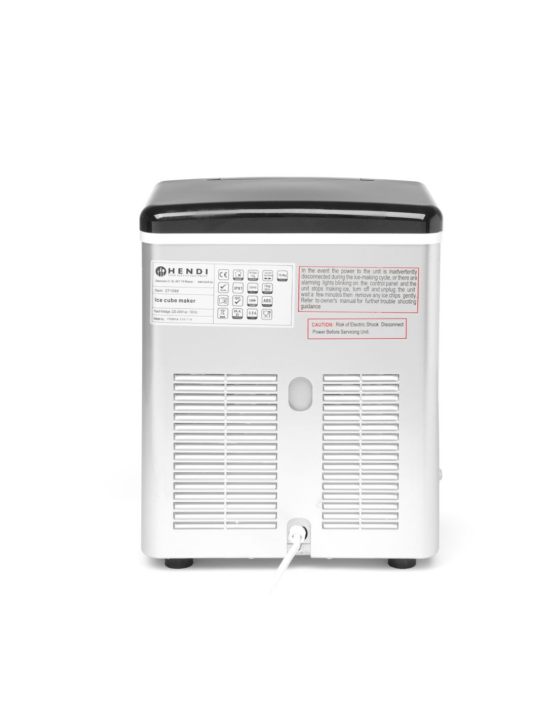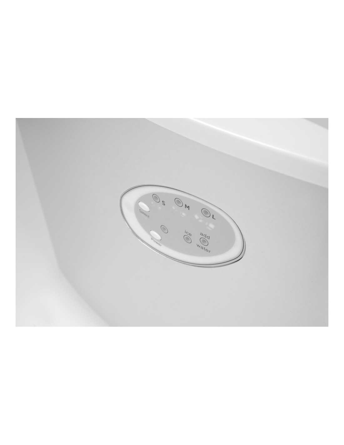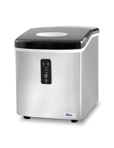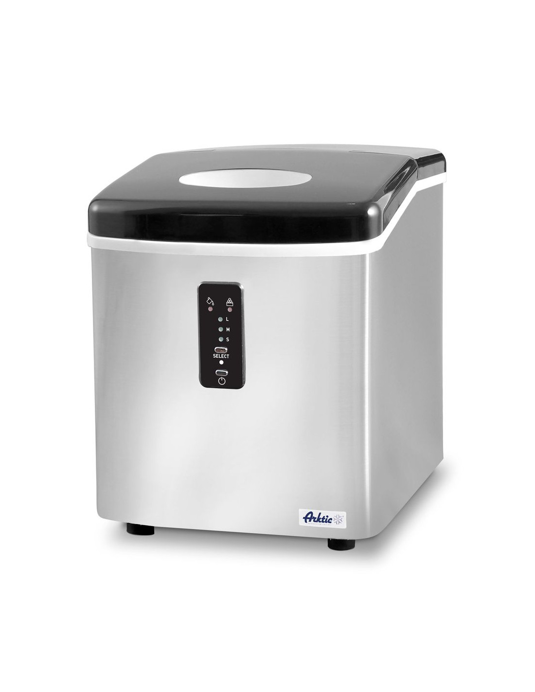 Bordsmodell. Kropp i rostfritt stål, lock i svart ABS. Kapacitet 12 kg per 24 timmar, buffertlager 3,2 kg - 9 isbitar per cykel. Ingen fast vattenanslutning - kylvätska: R600A. Val av 3 isbitsstorlekar, tärningarna formas runt kylstavar. Rymmer 100 isbitar.