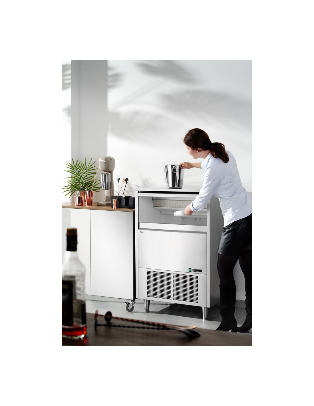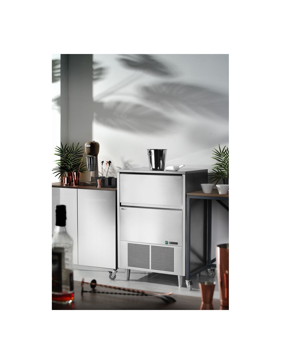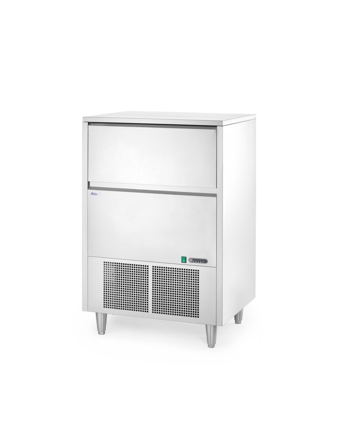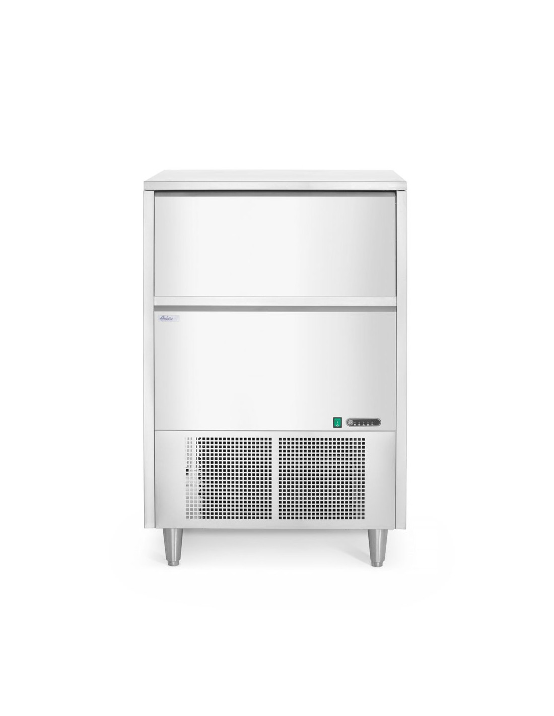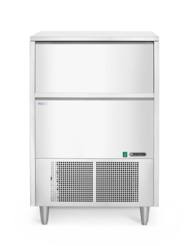 Hölje av rostfritt stål. Producerar klara isbitar som smälter långsammare än andra typer av is. Luftkyld – fläktassisterad statisk kylning. Indikatorer för låg vattennivå och full isbehållare. Automatisk avfrostning och automatisk rengöring. Isbehållarens kapacitet: 45 kg. Produktionskapacitet: 80 kg/24 h. Köldmedium: R290.
