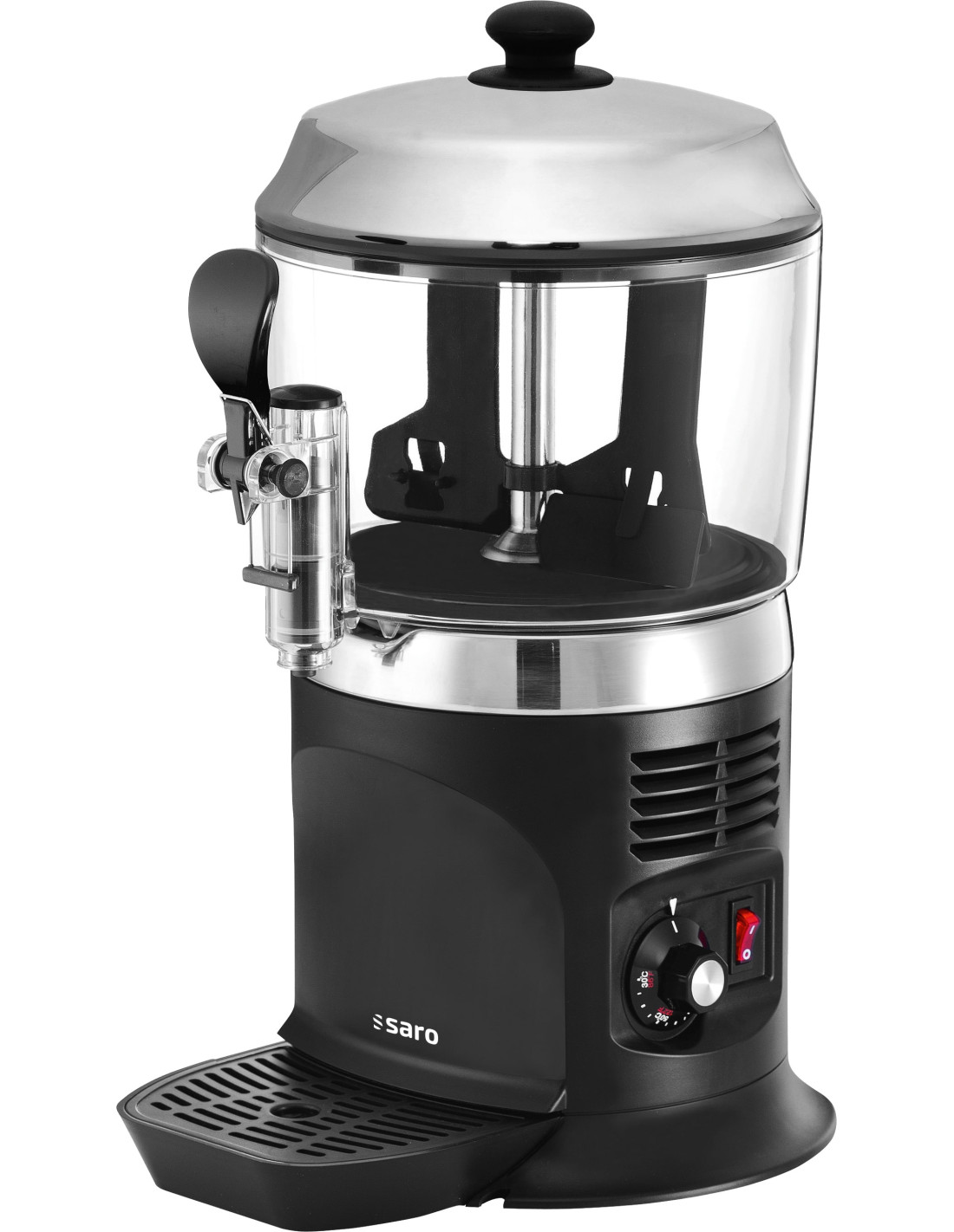 Material: (Hölje, droppbricka, omrörningsmekanism) svart plast; (Behållare) transparent plast; (Lock) rostfritt stål