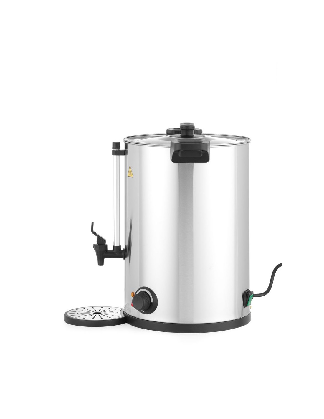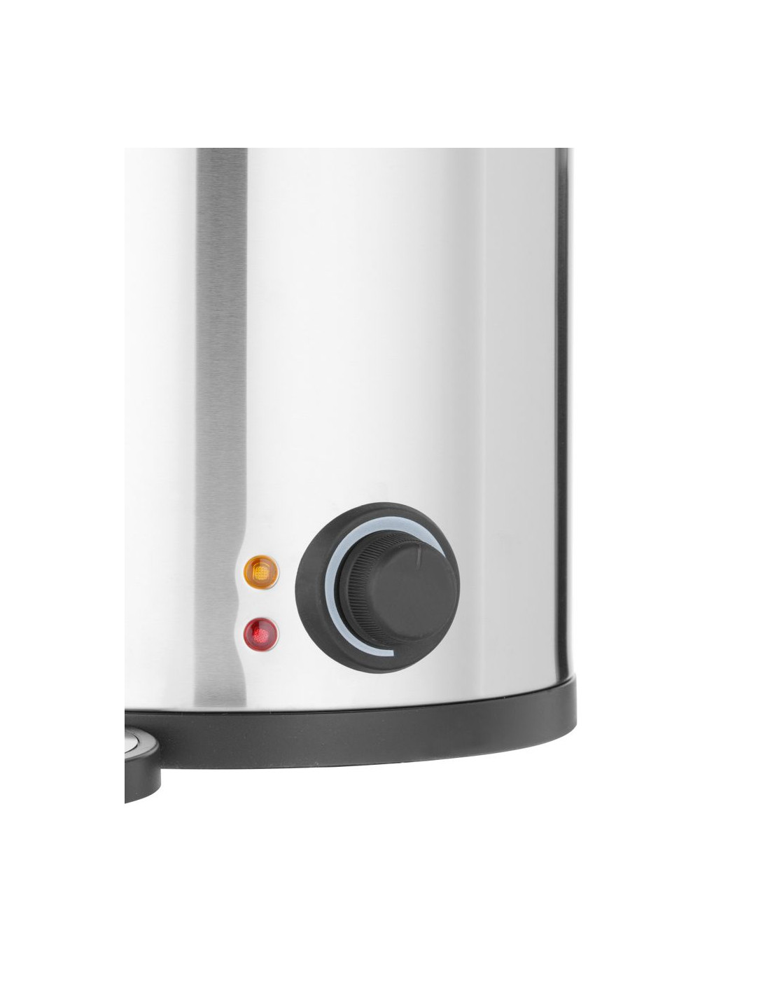 Perfekt för glögg och kokande vatten till te. Fungerar automatiskt och håller dryckerna vid serveringstemperatur. Värmeförlust och energiförbrukning minskas av det isolerade, dubbelväggiga höljet i polerat rostfritt stål. Lock med säkert "twist-lock"-system. Kalksäkert värmeelement under tanken med överhettningsskydd. Utrustad med cool-touch-grepp, lockhandtag och droppskydd, allt tillverkat av polypropen. Tydlig nivåindikator i liter. Maximal kopphöjd: 130 mm (utan droppbricka). Med strömbrytare och indikatorlampor för uppvärmning och felsökning. Temperaturen kan ställas in från 30 °C till 100 °C. Droppbricka ingår. Ger ± 60 koppar på 40 min. Ej lämplig för chokladmjölk.