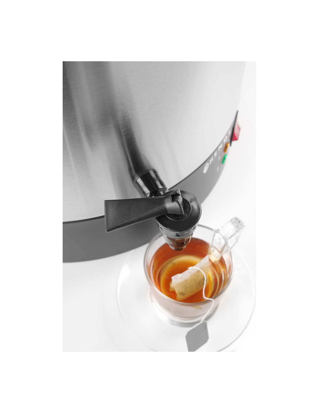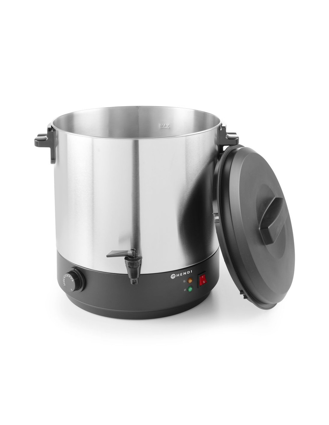 Vattenkokare tillverkad av rostfritt stål. Utrustad med isolerade handtag i polypropen och droppfri kran. Termostat justerbar upp till 110 °C. Perfekt för glögg eller varmt vatten. Kokningstid ≤ 75 min. Ej lämplig för chokladmjölk.