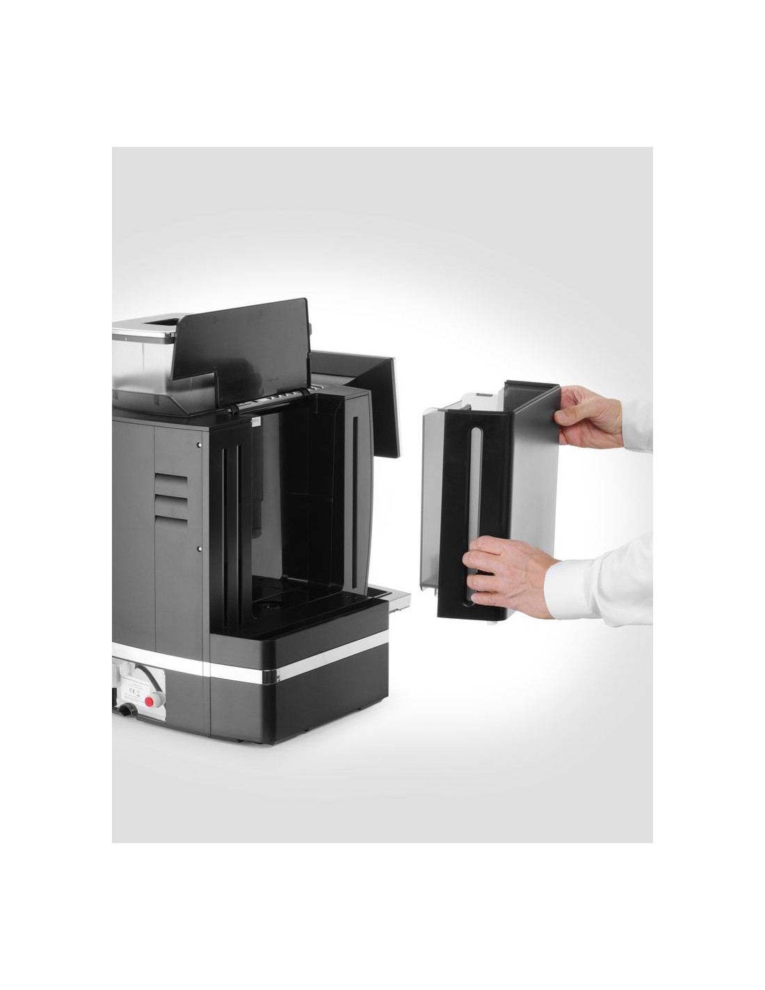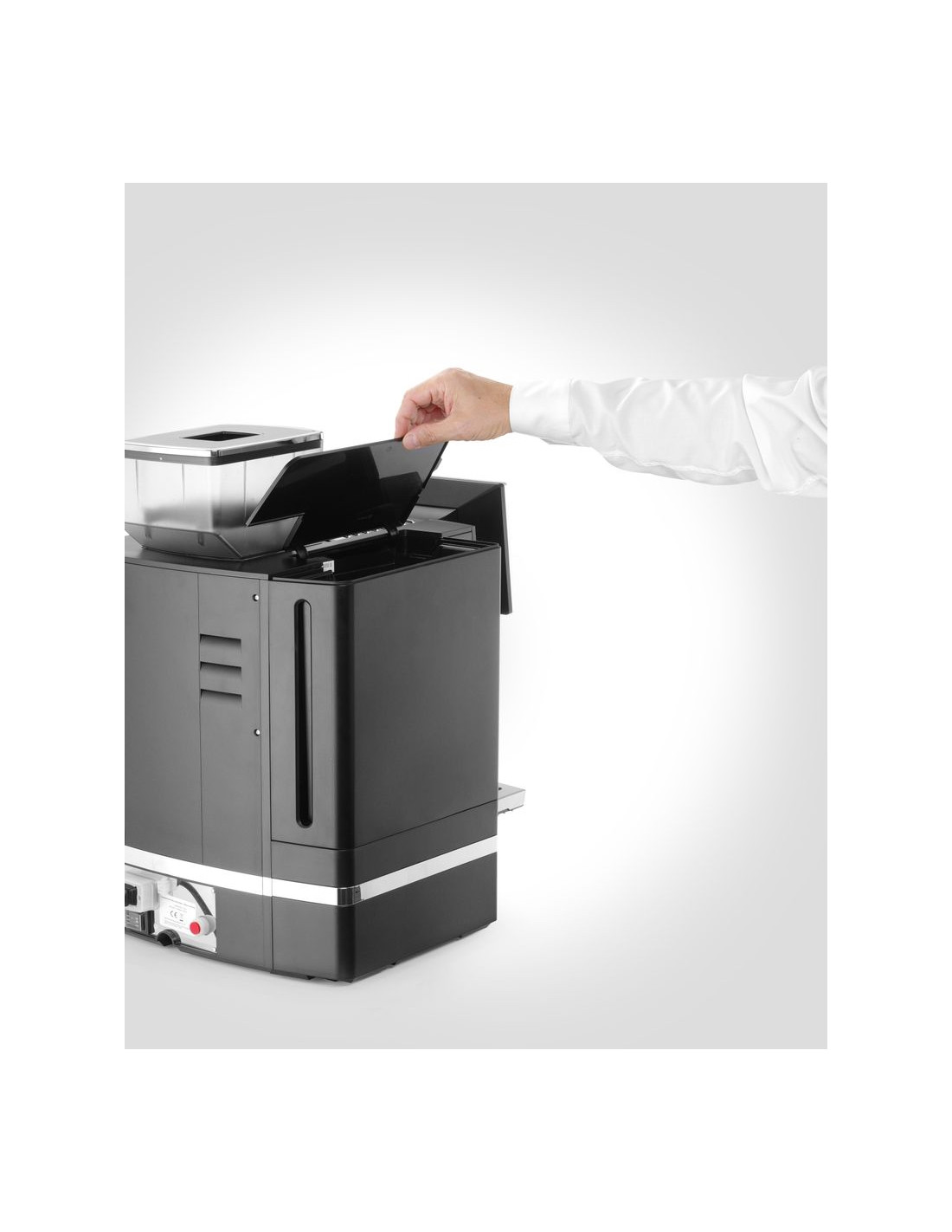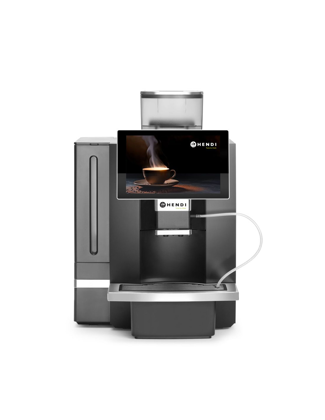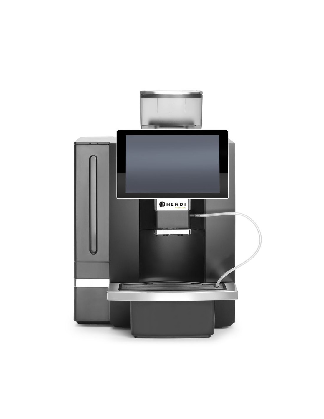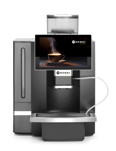 Hölje av ABS-plast. Upp till 20+ programmerbara drycker. 6 liters vattentank eller direkt anslutning till vattenledningen. Koniskt malverk, 9 malningsnivåer, malningshastighet 1,9 g/s. Varm mjölk och varm mjölkskumning med 2 temperaturnivåer. Behållare för 1 kg kaffesump. Timkapacitet (per kopp) - espresso 105, varmt vatten: 75, cappuccino 105. Avsedd produktionskapacitet: 80-100 koppar. Behållare för kaffesump: upp till 30 portioner. Flyttbar kaffedispenser, justerbar höjd mellan 80-160 mm. USB-anslutning. Vattenpumptryck 19 bar. Inkluderade tillbehör: 1 mjölkslang, 50 cm. 1 universalnyckel. 1 vattenavloppsslang med adapter, 100 cm. 1 vattentillförselslang, 150 cm. 1 filteranslutning. Justerbara funktioner: - Justerbara malningsnivåer: 5-9 nivåer. - Kaffestyrka: välj från 7 g till 16 g per kopp. - Kaffevolym. - Kaffetemperatur. - "FÖRBRYGGNING"-alternativ. - Mängd varmvatten, temperatur och bryggtid. - Bryggtid för skummad mjölk. - Bryggt kaffe. HENDI Automatic-kaffemaskinen är en modern, helautomatisk maskin som är idealisk för medelstora kaféer, hotell, motell, vandrarhem, bensinstationer, kontor, matsalar och cateringmiljöer som letar efter utsökt, snabbbryggt kaffe. Dess användarvänliga, lättlästa valpanel och snabbbryggning gör den perfekt för självbetjäning. Maskinen har en stor 10-tums färgpekskärm och digitala kontroller för intuitiv användning. Med upp till 17 programmerbara drycker – inklusive espresso, lungo, ristretto, americano, cappuccino, latte macchiato, vitt kaffe, kaffekanna, varmt vatten och olika alternativ för dubbelservering och mjölkbaserade drycker – kan användarna njuta av ett brett utbud av drycker. Varje dryck kan justeras individuellt för att passa specifika preferenser. En metallkondensor leder ånga till droppbrickan, vilket bibehåller renlighet och säkerhet under drift. Möjligheten att brygga två koppar samtidigt ökar effektiviteten, medan den justerbara kaffedispensern rymmer koppar upp till 165 mm höga. Maskinen har automatisk sköljning för både bryggenheten och mjölksystemet. Dessa funktioner använder vatten från vattentanken, så regelbunden påfyllning krävs om enheten inte är ansluten till en direkt vattenförsörjning för oavbruten drift. En 19-bars vibrationspump säkerställer optimalt bryggtryck. Kaffesumpbehållaren rymmer upp till 35 portioner (beroende på kaffesort), och 2-liters droppbrickan samlar upp avloppsvatten effektivt. En vattenfilteradapter ingår också för installation i vattentanken.
