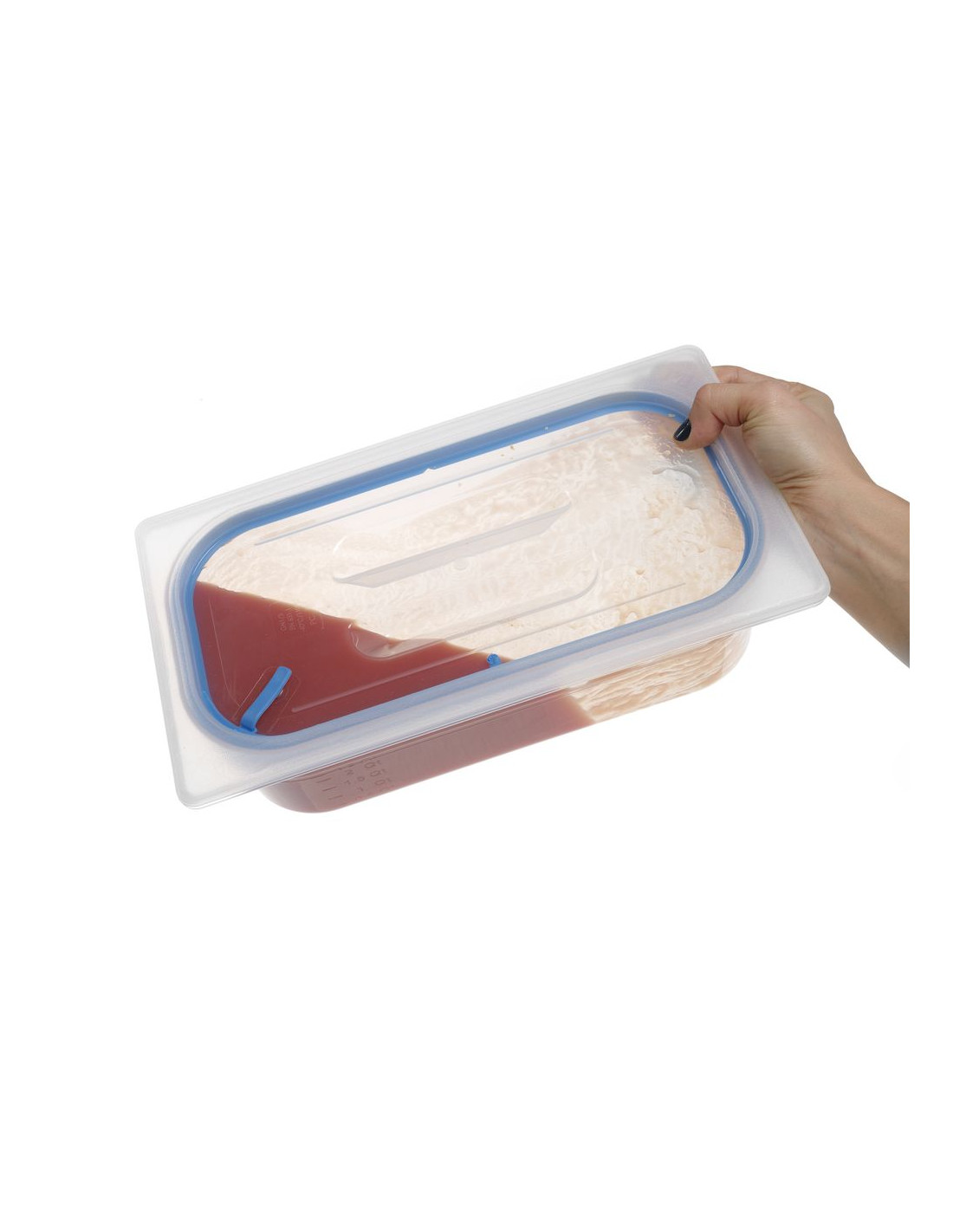 Lock med hermetisk santoprenförsegling; förseglingen är tillräckligt tät för att förhindra läckage när behållaren lutas. Med läpp för att bryta den lufttäta förseglingen för enkel öppning. Passar HENDI GN-behållare av polypropylen.