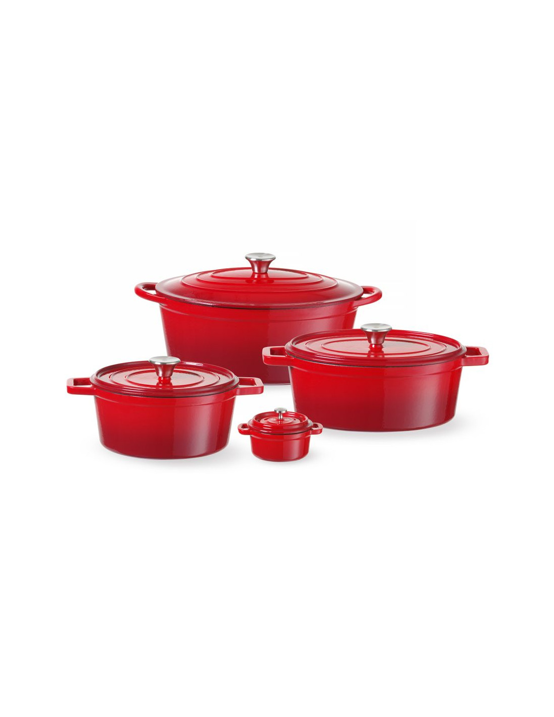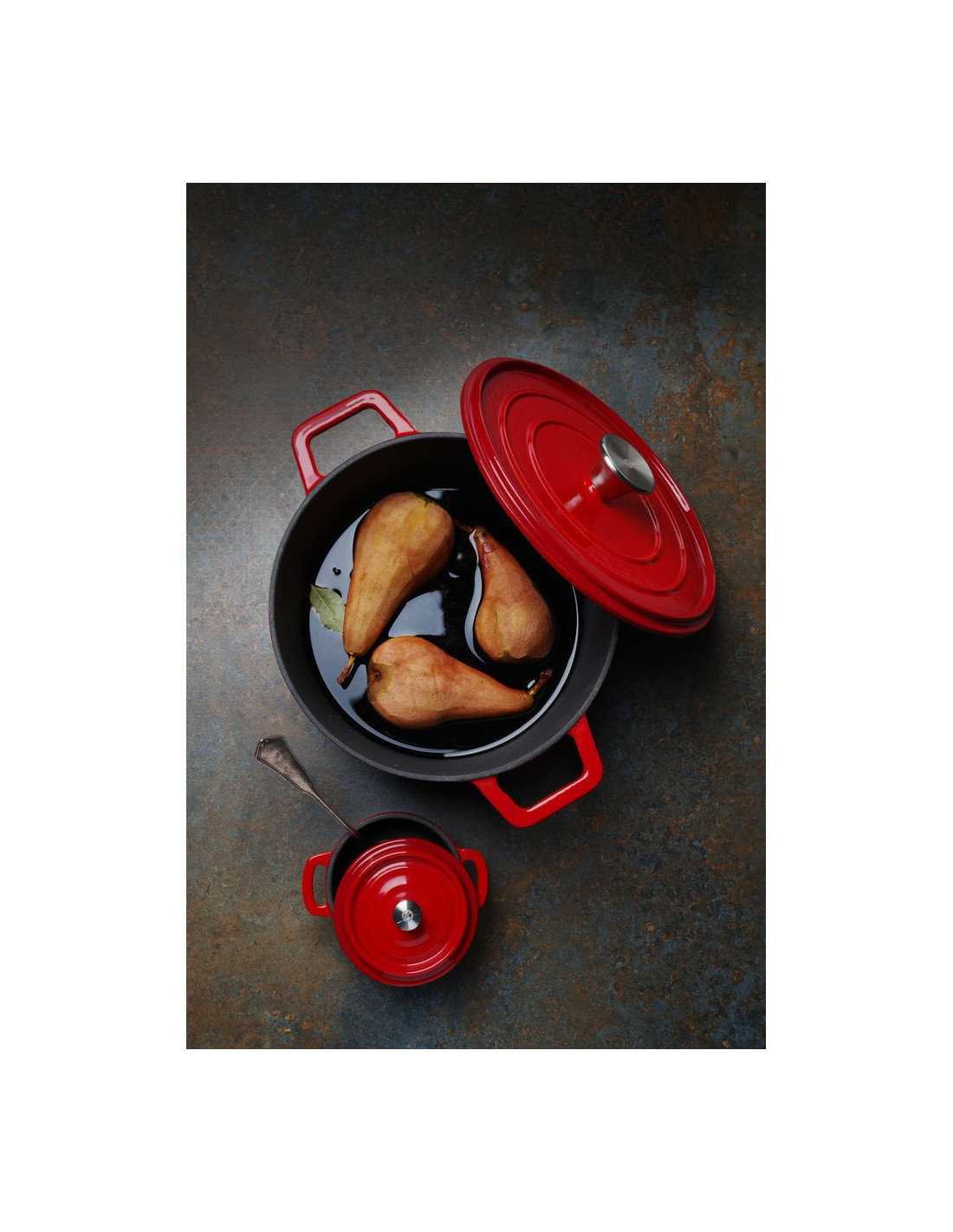 Tillverkad av gjutjärn med emaljbeläggning på utsidan. Locket har upphöjningar på insidan som tvingar vattendroppar (ånga) att falla tillbaka, vilket håller fatet fuktigt och aromatiskt. Lämplig för alla värmekällor inklusive induktion. Ej diskmaskinssäker. Finns i olika storlekar; den minsta kan användas som serveringsfat (kod: 626856, 626894).