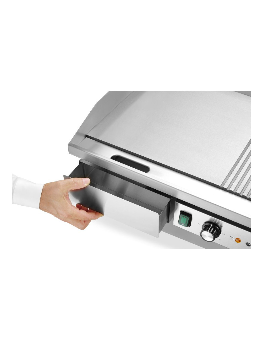 HENDI SMART grillplatta är en mångsidig 2-i-1-enhet som kombinerar en slät och räfflad grillyta. Två oberoende värmezoner låter dig steka ömtåliga livsmedel och saftigt kött vid olika temperaturer samtidigt. Den tjocka 10 mm härdade stålplattan garanterar perfekt värmefördelning och perfekta resultat.