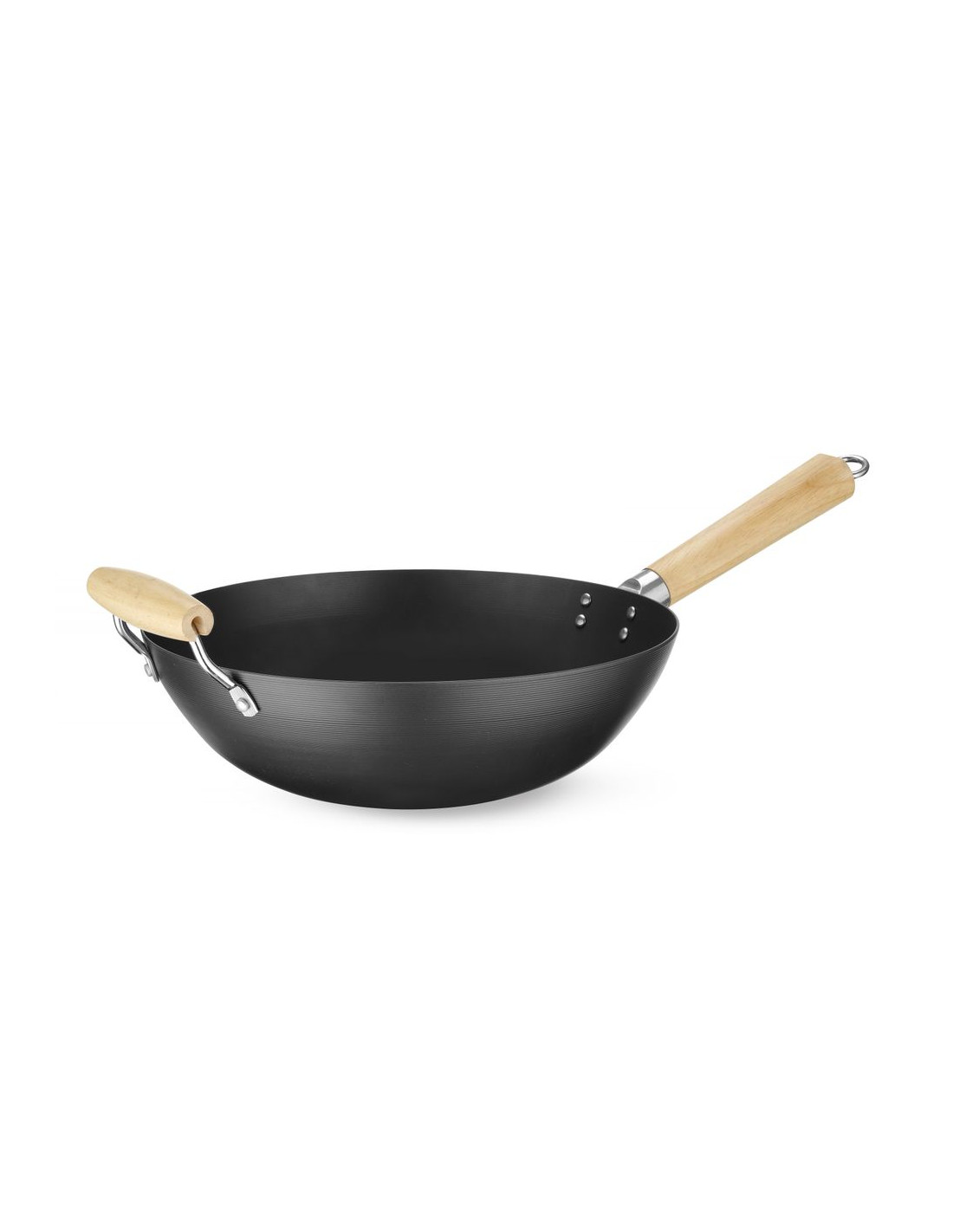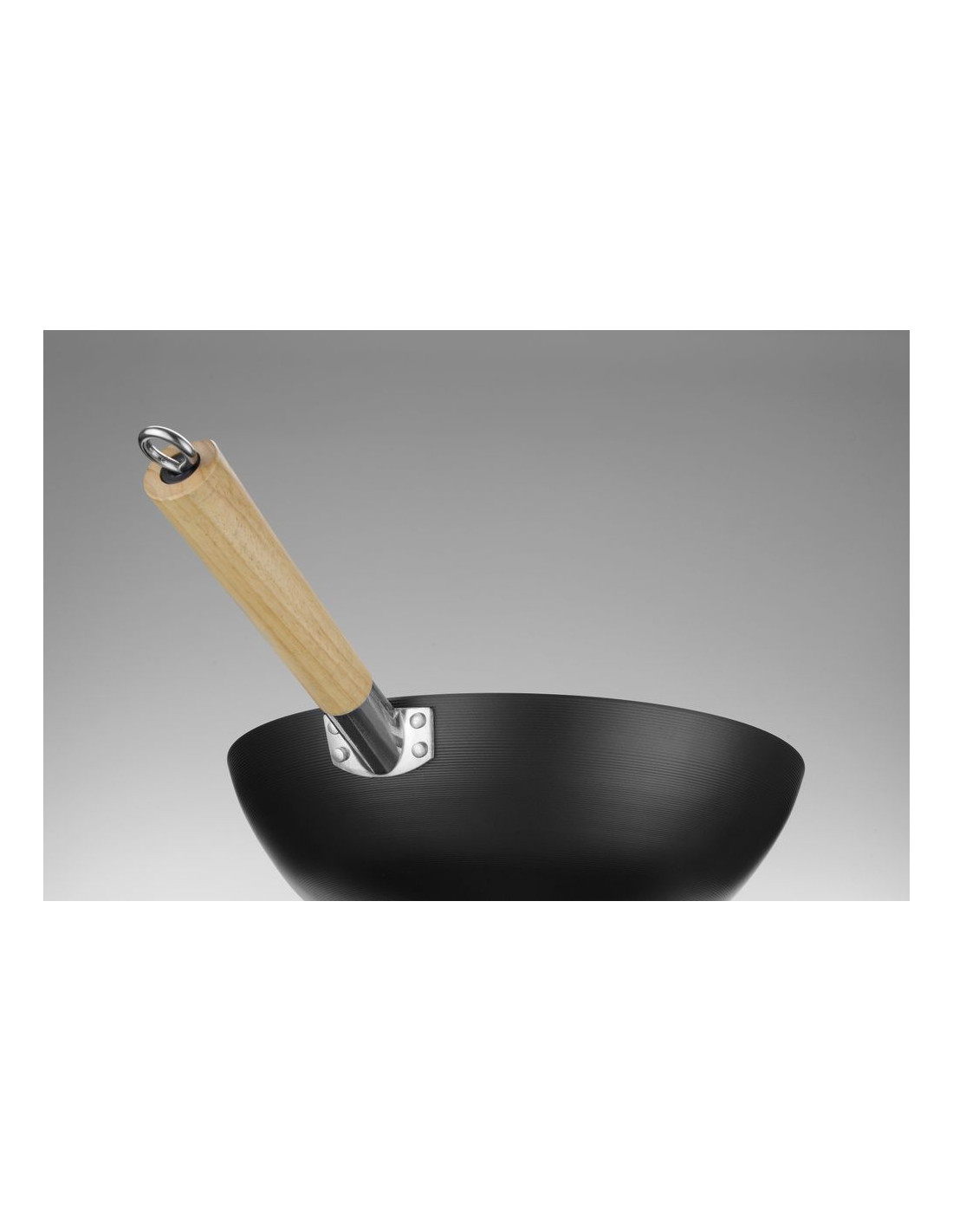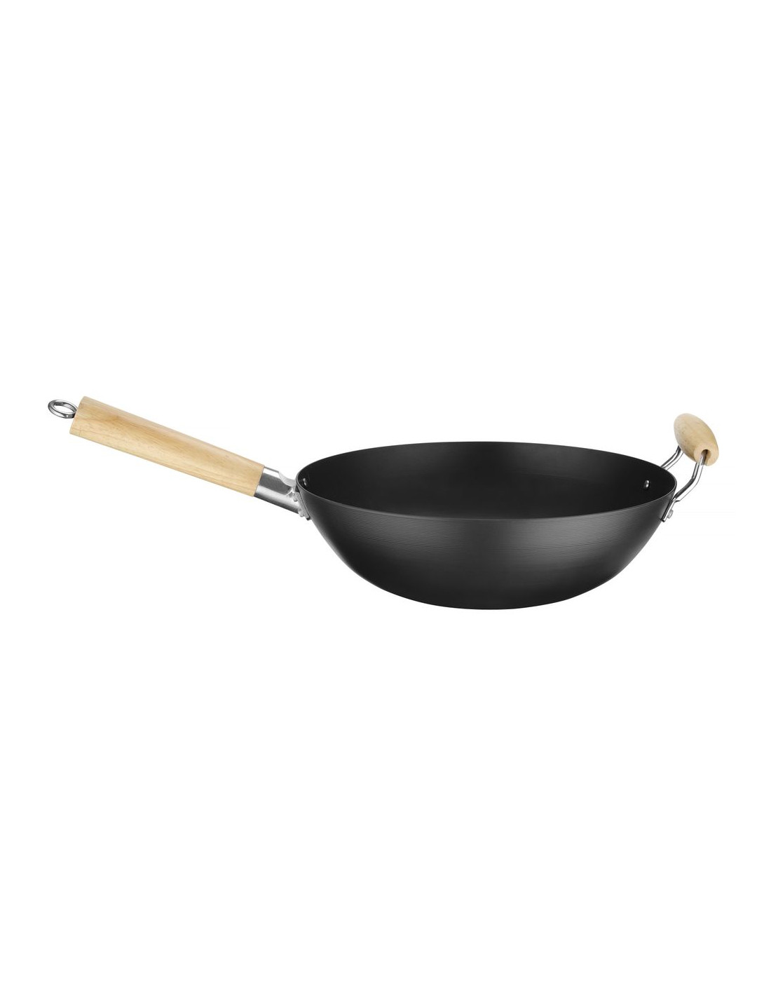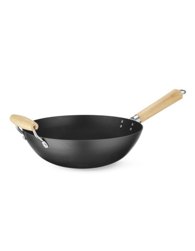 HENDI Wok med trähandtag är tillverkad av kolstål, vilket garanterar utmärkt värmeledningsförmåga och tålighet, och motstår mycket höga temperaturer utan att skadas. Trähandtaget förblir svalt vid beröring och ger ett bekvämt grepp vid manövrering av woken. Detta gör den idealisk för matlagningstekniker som kräver intensiv värme för att uppnå den karakteristiska smaken och brynet.
