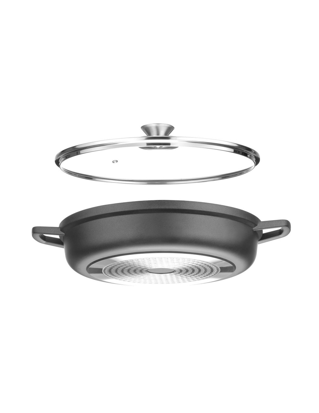 Tillverkad av pressgjuten aluminium med värmebeständig beläggning. PTFE non-stick-beläggning. Knopp av rostfritt stål. Lämplig för användning på gas-, induktions-, elektriska och keramikhällar. Induktionsbotten. Ugnssäker upp till 250 °C; ej lämplig för användning vid högre temperaturer. Diskmaskinssäker. Grytan är ugnssäker. Locket är inte ugnssäkert.