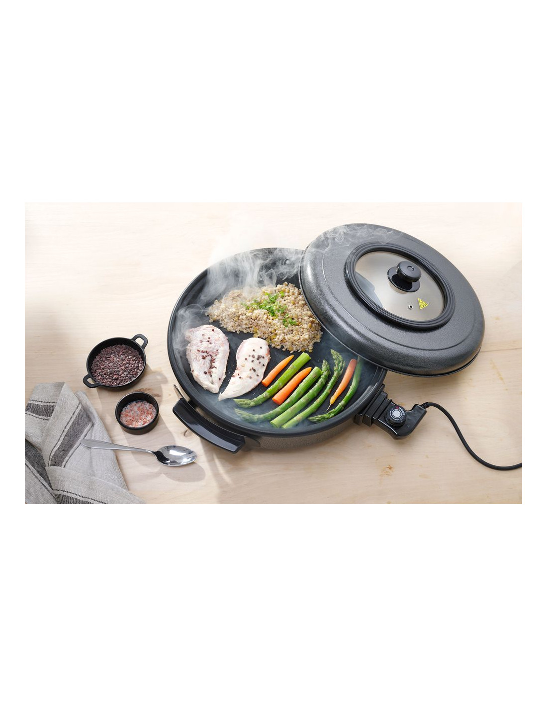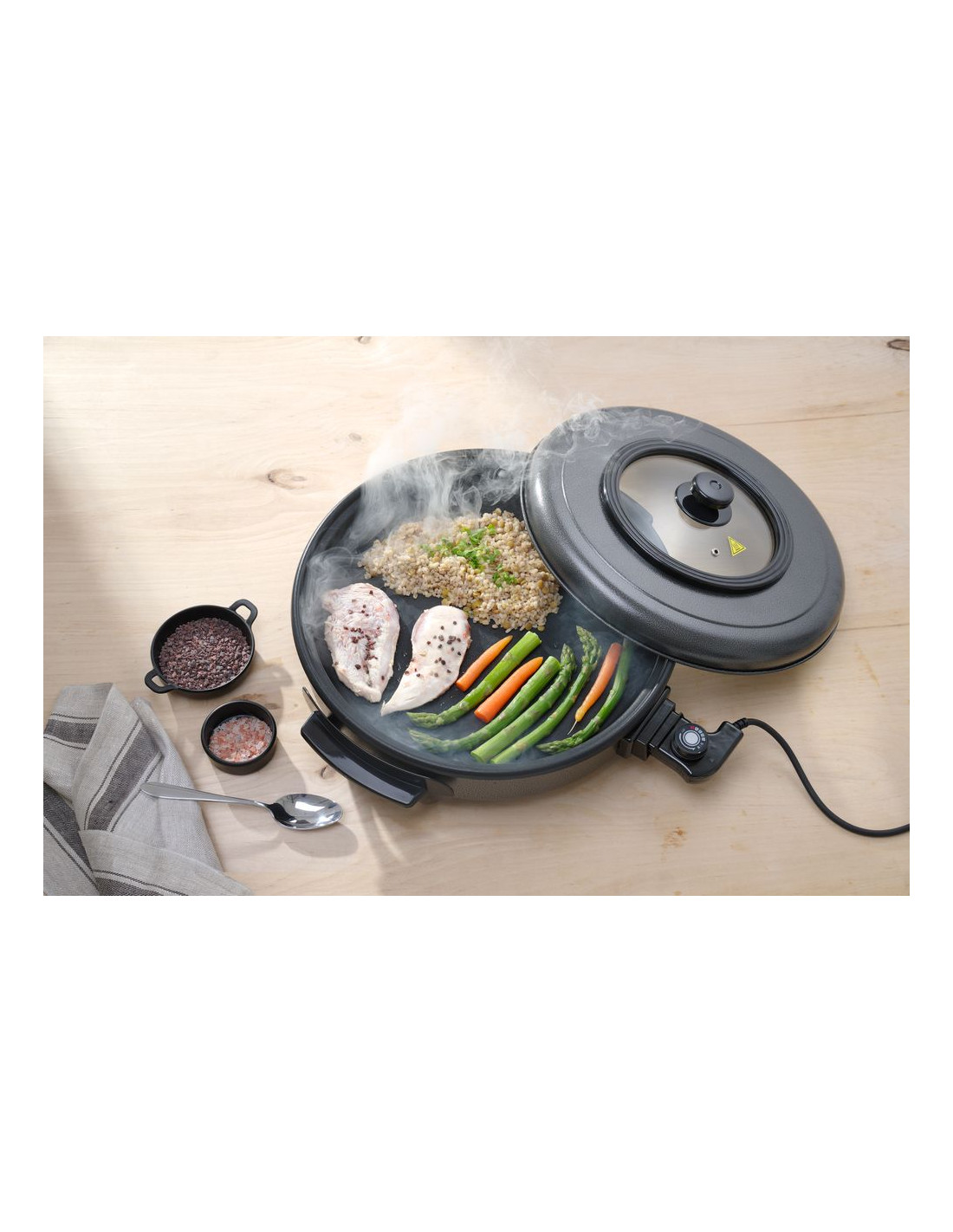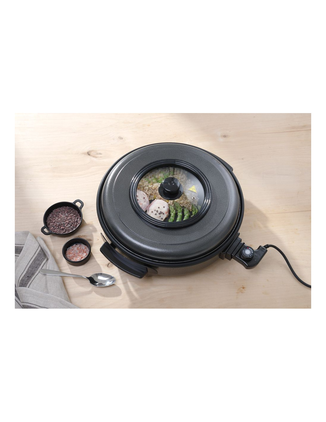 Aluminium med non-stick-beläggning. Avtagbar termostat. Lämplig för stekning, rostning och varmhållning. Inklusive lock med klarglas och två isolerade handtag.