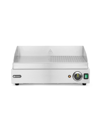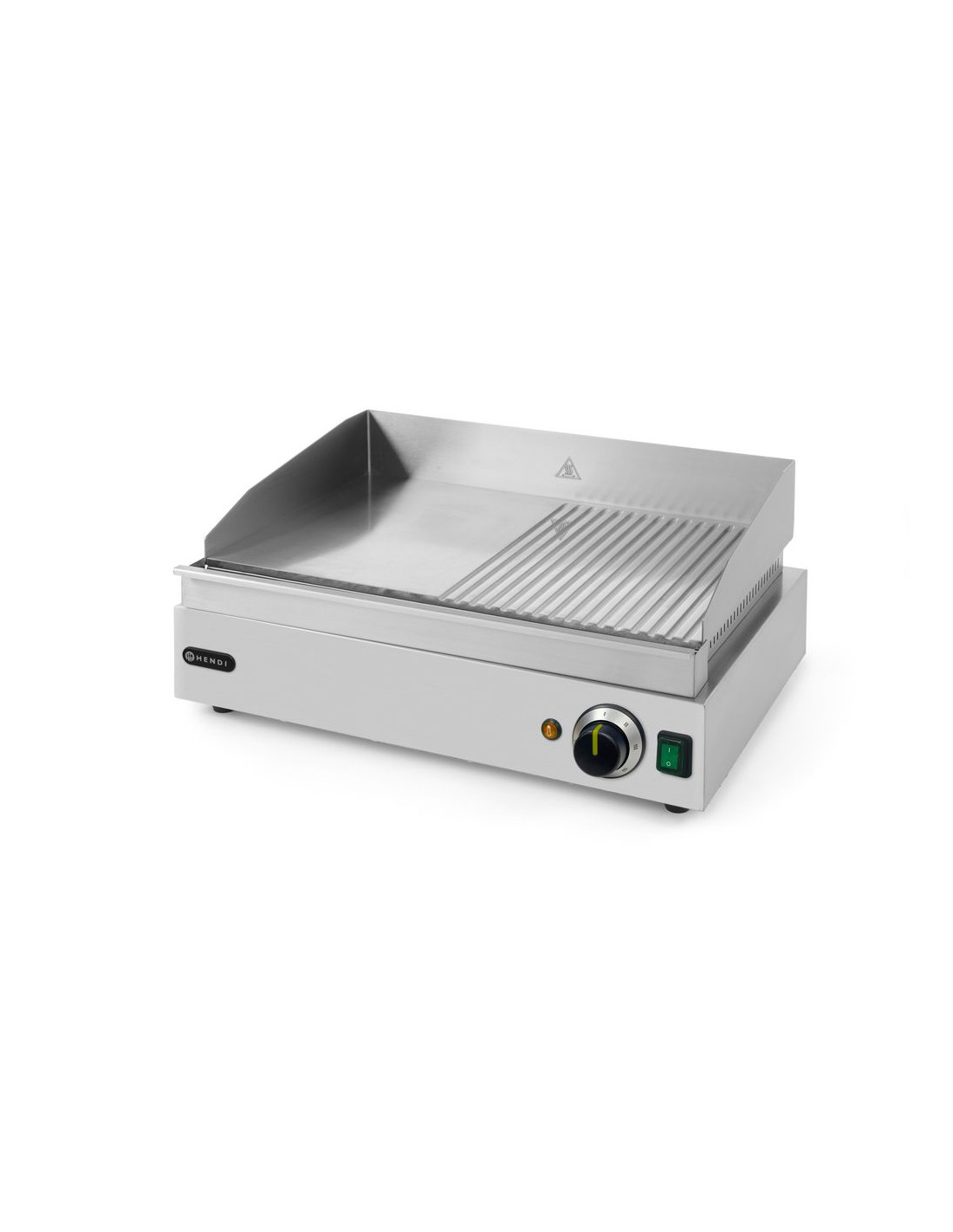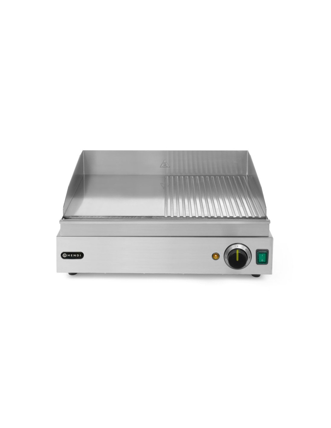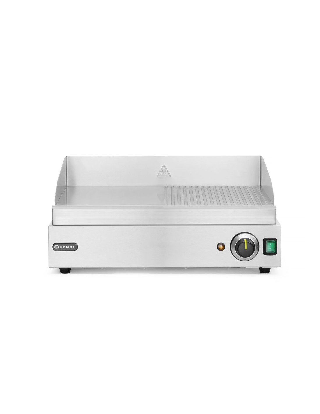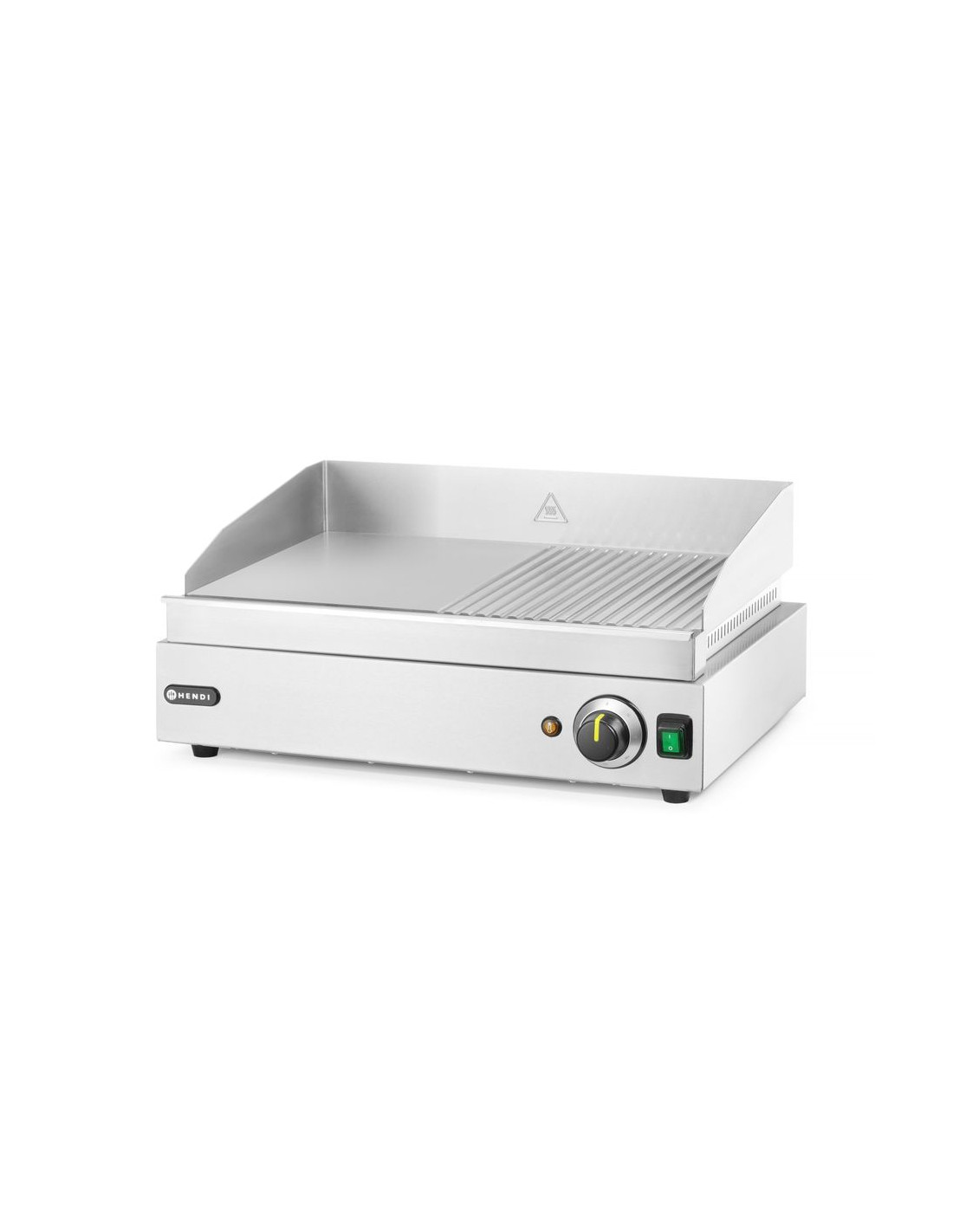 HENDI-stekpannan, halvräfflad, har ett robust hölje i rostfritt stål och en hållbar 9 mm hårdförkromad stekplatta som säkerställer jämn värmefördelning och enkel rengöring. Utrustad med en steglös termostat justerbar upp till 300 °C och överhettningsskydd, stöder den kontinuerlig användning i hektiska professionella kök. Designen inkluderar en avtagbar droppbricka, höga stänkskydd, halkfria fötter och en strömbrytare med en integrerad indikatorlampa för säker och effektiv drift.