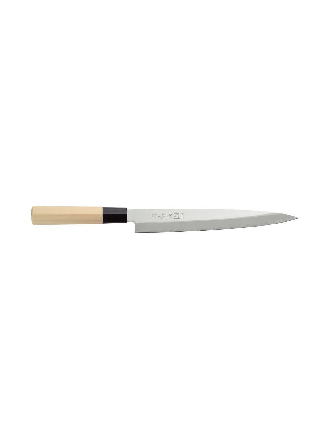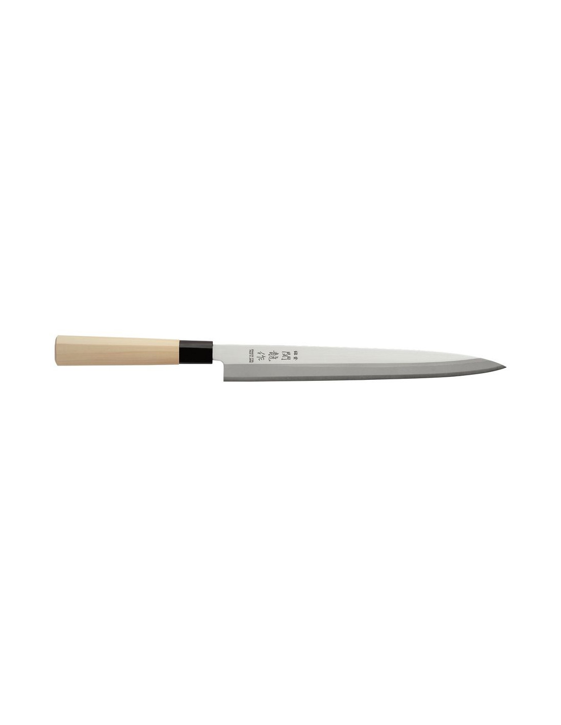 Eggen är slipad på ena sidan. Långt, tunt blad, perfekt för att fileera små till medelstora fiskar, skiva fiskfiléer för sashimi och sushi i en enda rörelse.