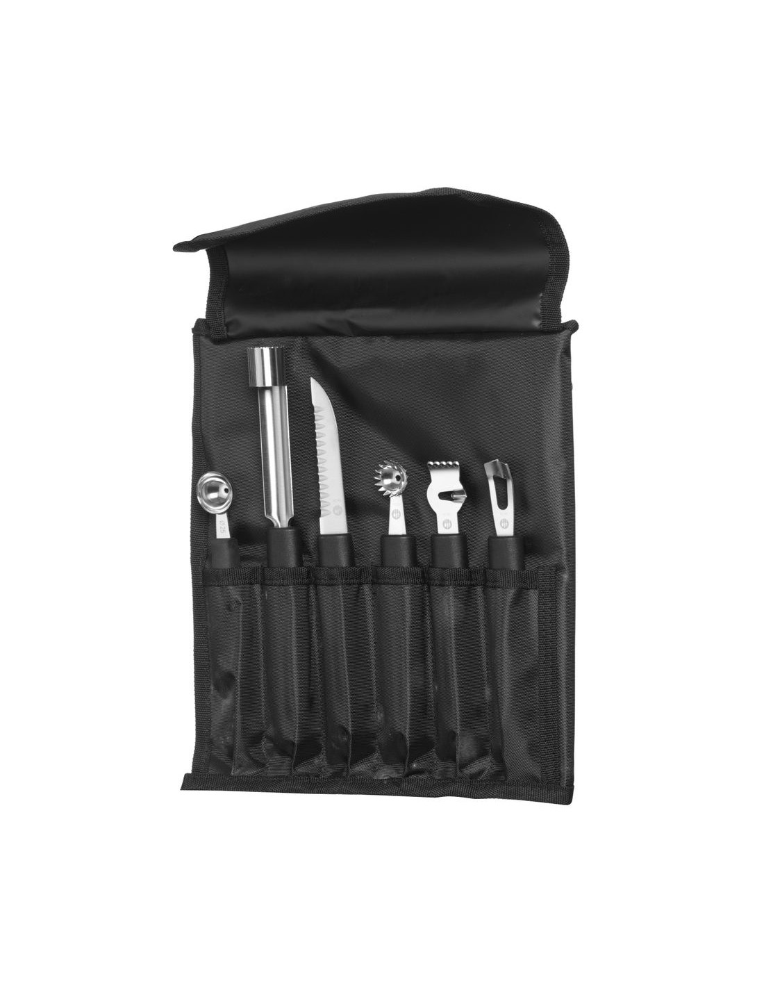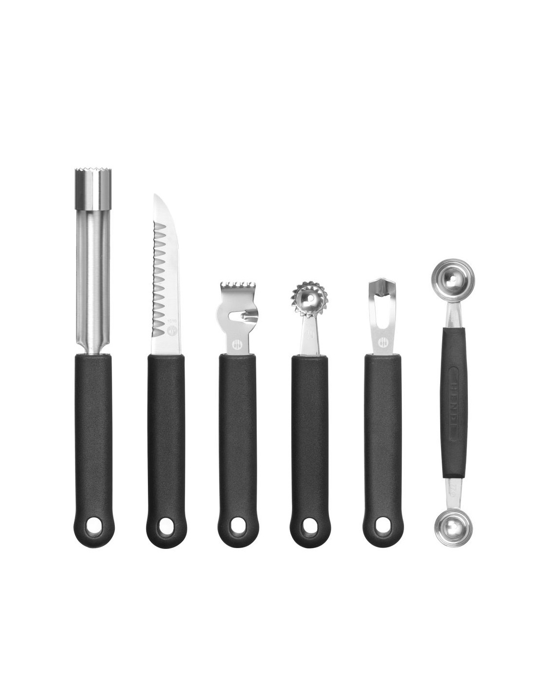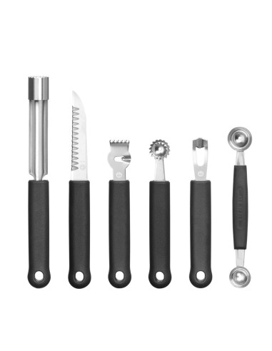 Setet innehåller: – Fruktbollspress med dubbel ände – Frukturkärnningskniv Ø 20 mm – Dekorationskniv – Fruktbollspress med tandad ände – Citruszest – Kantkniv