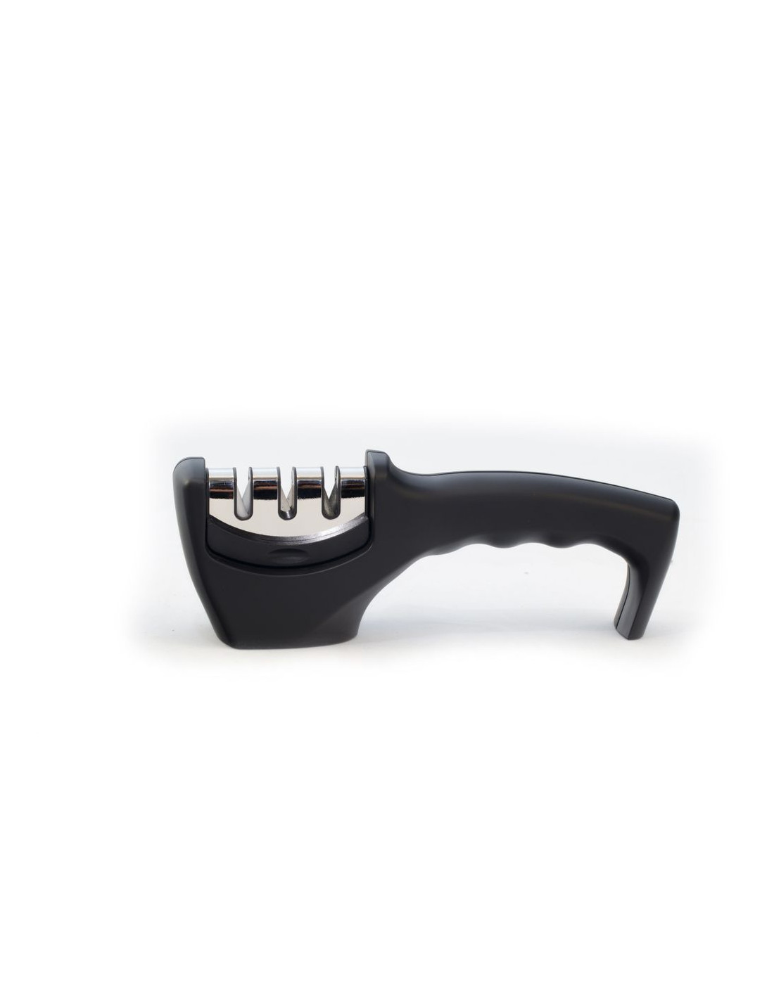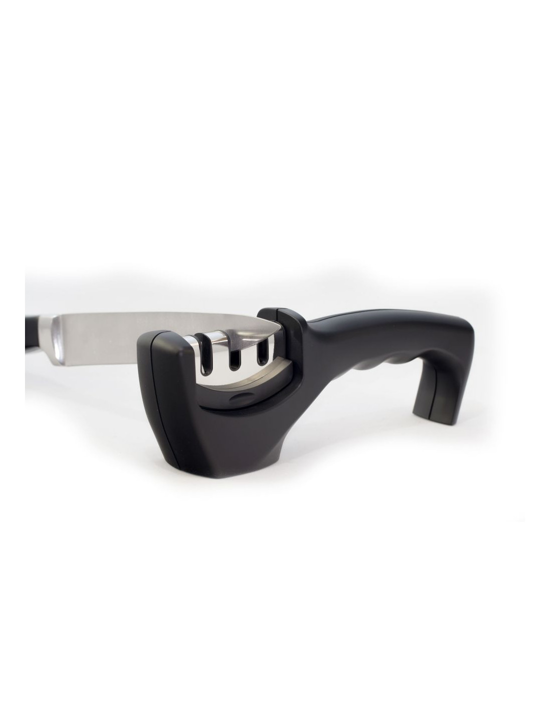Ergonomiskt handtag och halkfri bas ger säkerhet och komfort. 3 funktioner för att slipa alla typer av knivar, även keramiska knivar. COARSE: hårdmetallslipare för en precisionsegg varje gång. FINE: korsade keramiska stavar för professionell eggslipning. KERAMIC: korsade elektropläterade stavar för keramiska knivar. Använd inte för att slipa tandade blad eller saxar.