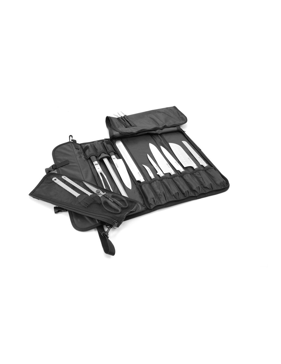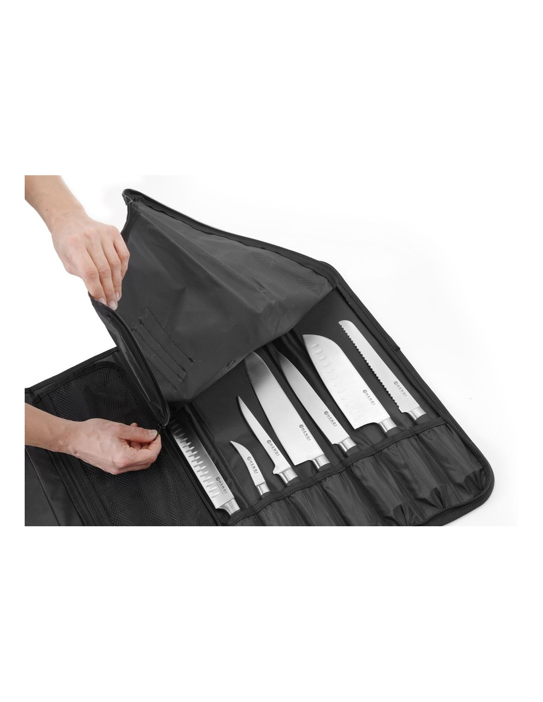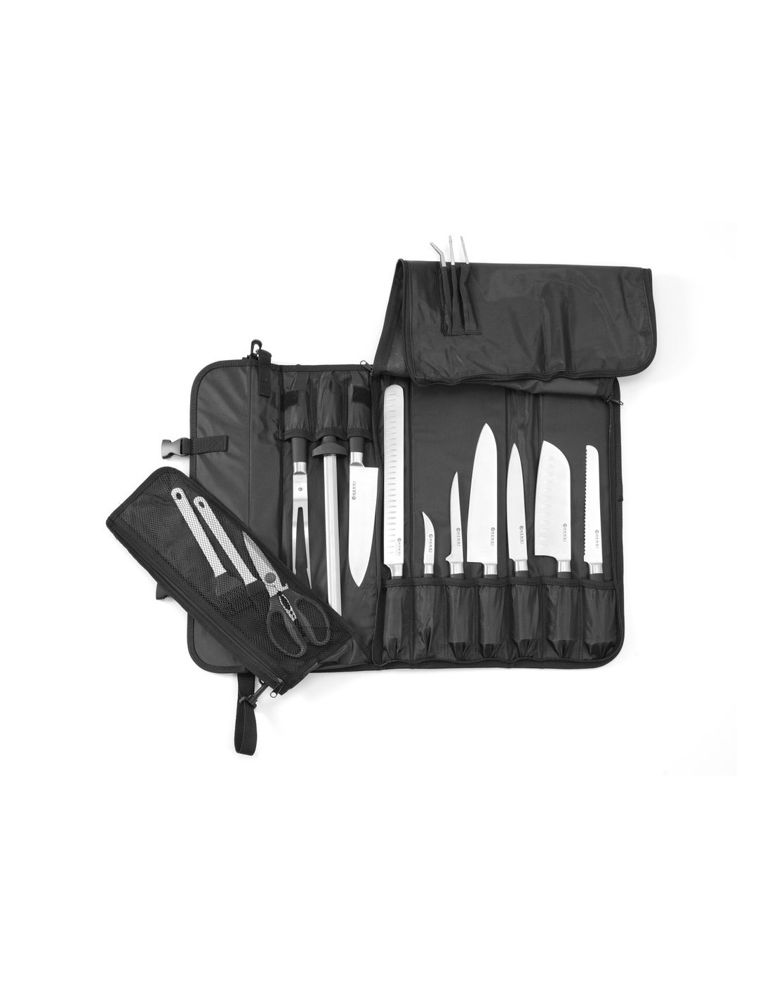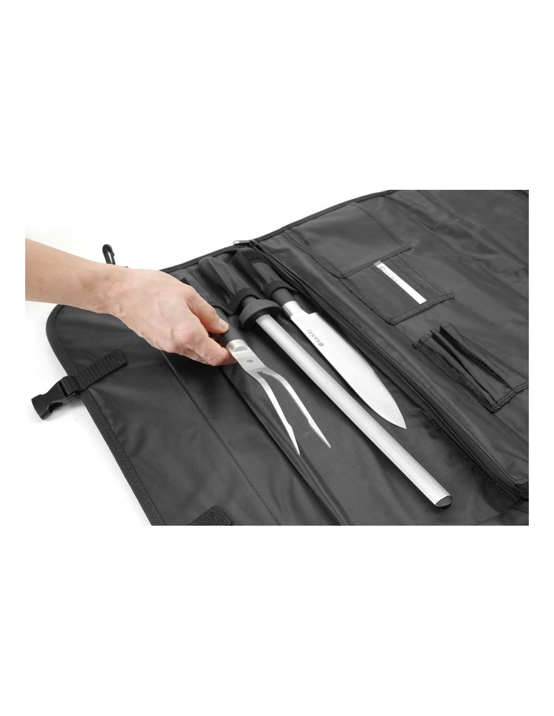 Kompakt väska med gott om plats för knivar och tillbehör. Plats för 10 knivar (maxlängd 450 mm), knivarna hålls på plats med resår. Knivarna är skyddade av extra skydd som hålls på plats med antingen dragkedja eller kardborreband, vilket säkerställer att knivarna inte kommer i direkt kontakt när väskan är hopfälld. Med 1 stor ficka för anteckningsblock, 4 små fickor för visitkort och plats för 3 pennor eller andra små tillbehör. Axelremmens längd kan justeras mellan 770 mm och 1270 mm. Mått utfälld: 515x675 mm. Knivar ingår ej.