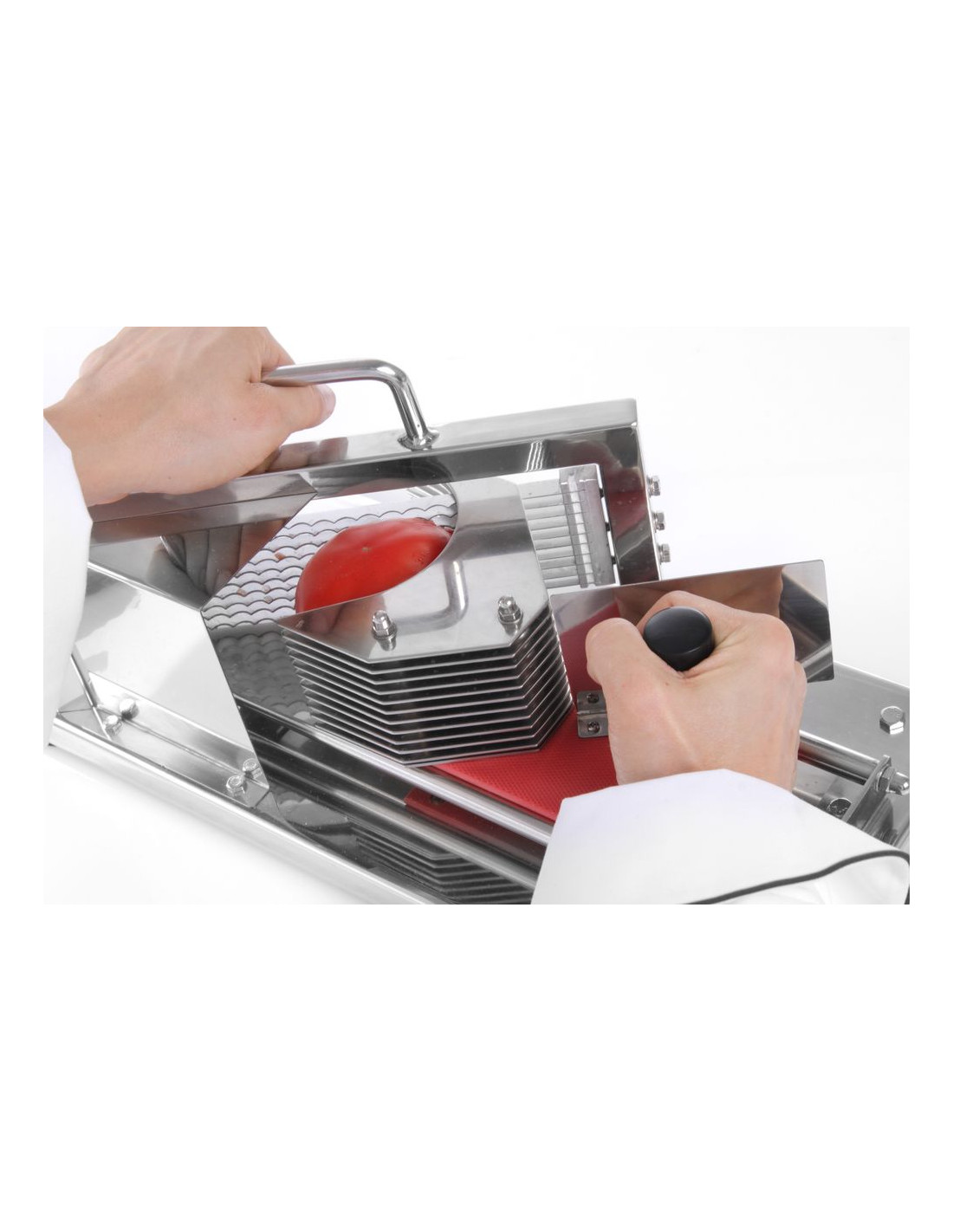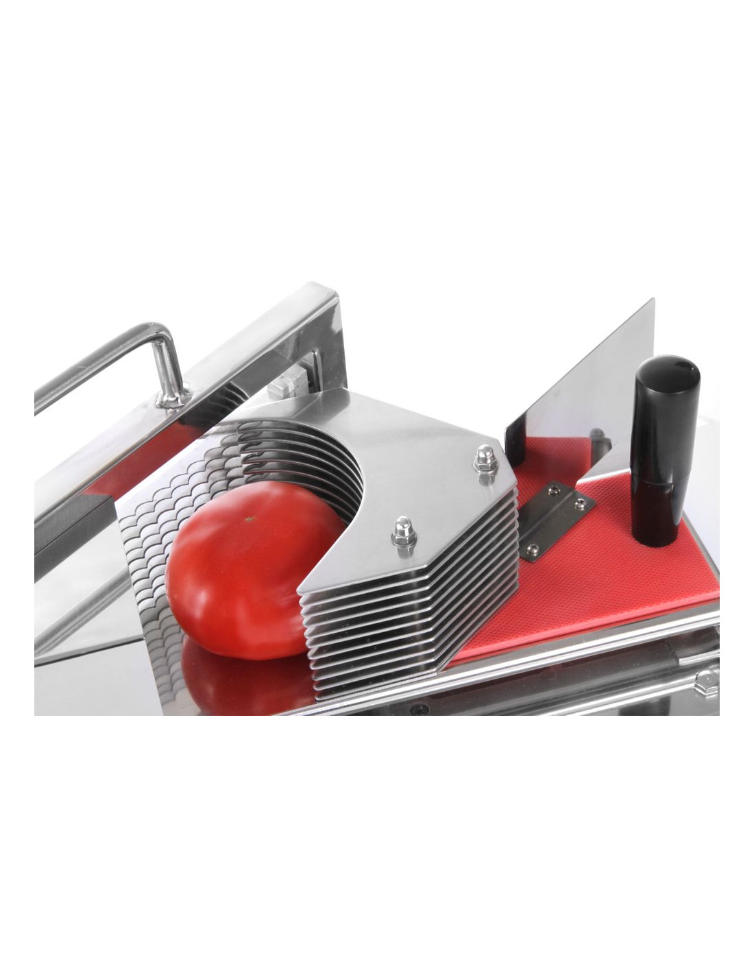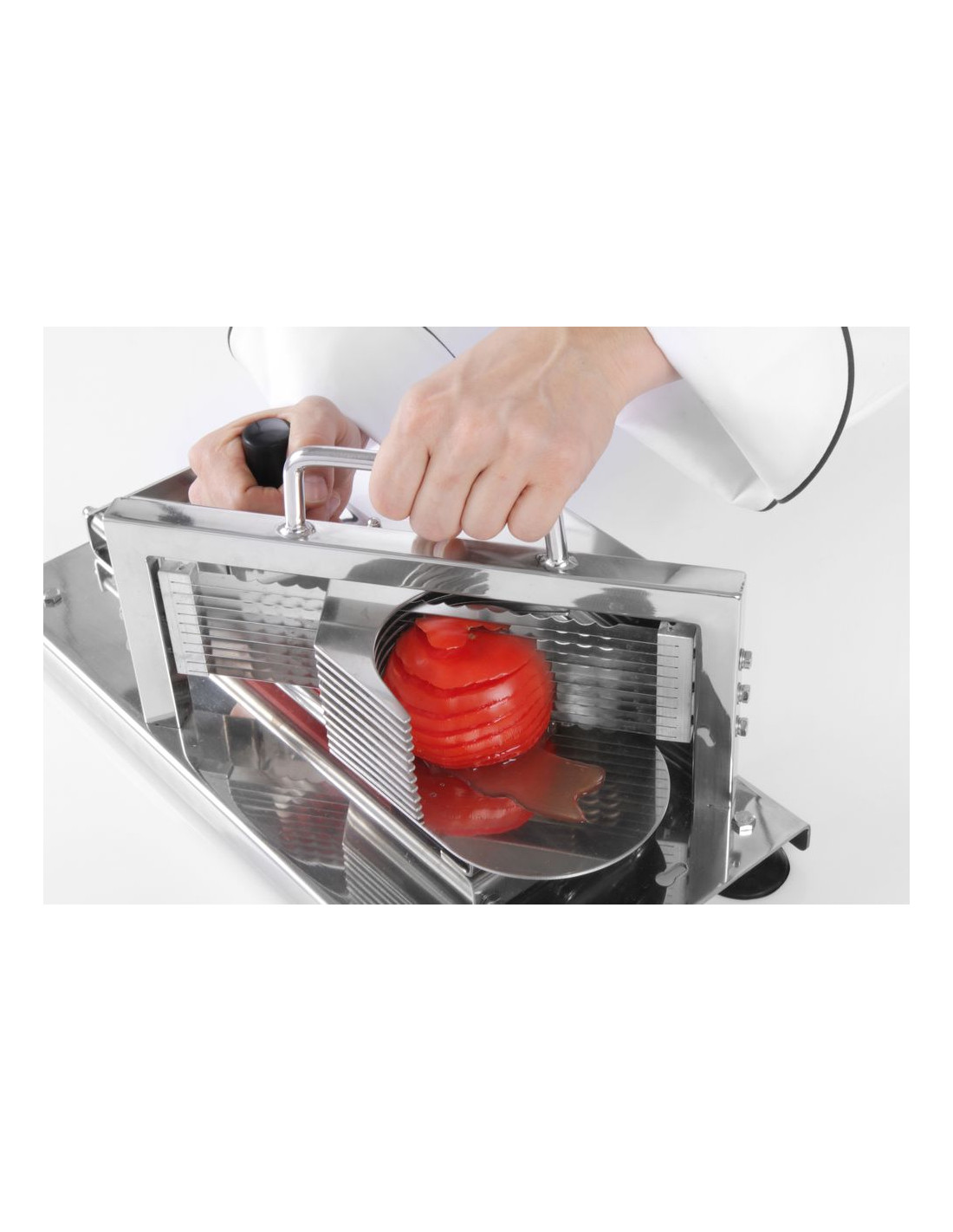 Endast för att skära tomater eller mjuka grönsaker/frukter. Skivtjocklek ≤ 5 mm. Lätt att rengöra. Med sugkoppsfötter. Skruvåtdragningsverktyg som insexnyckel ingår ej.
