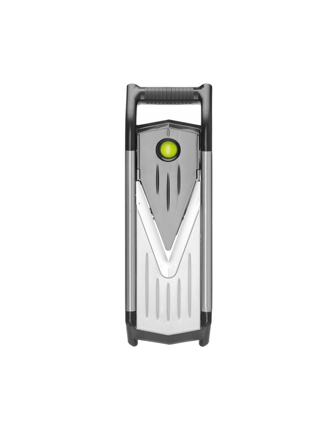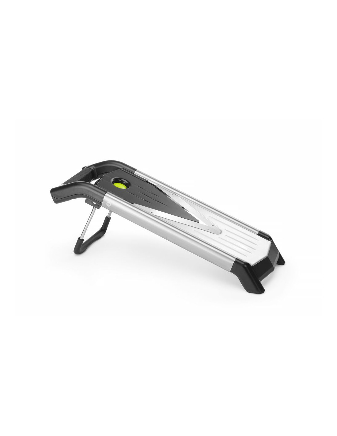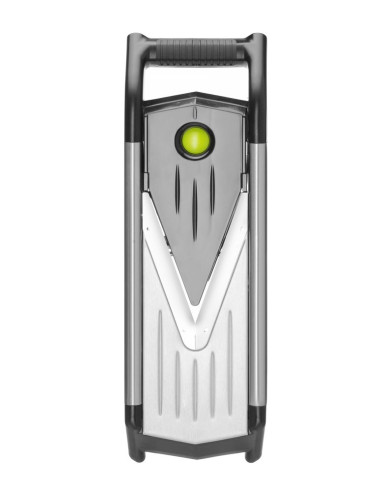 Tillverkad av rostfritt stål AISI 304 och ABS. Tjockleken kan ändras genom att byta ut plattorna, 1,5 mm, 2,5 mm och 3,5 mm. Med 2 plattor för julienne: 3,5 mm och 7 mm tjocka. Lås upp plattorna med den enda lås-/frigöringsknappen. De infällbara fötterna är klädda med halkfritt gummi, vilket säkerställer stabilitet under användning. Kan användas stående, placeras på en skål eller till och med i handen. Levereras med en förvaringslåda för plattorna, hållare för frukt och grönsaker för att skydda fingrarna under skivning och bladskydd för säker förvaring. Diskmaskinssäker.