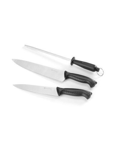 HENDI kniv- och slipverktygssetet innehåller två kockknivar i rostfritt stål (18 cm och 24 cm) och ett 23 cm slipverktyg i kolstål. Med slitstarka PP-handtag och diskmaskinssäkra knivar garanterar detta set tillförlitlighet och enkelt underhåll i hektiska miljöer.