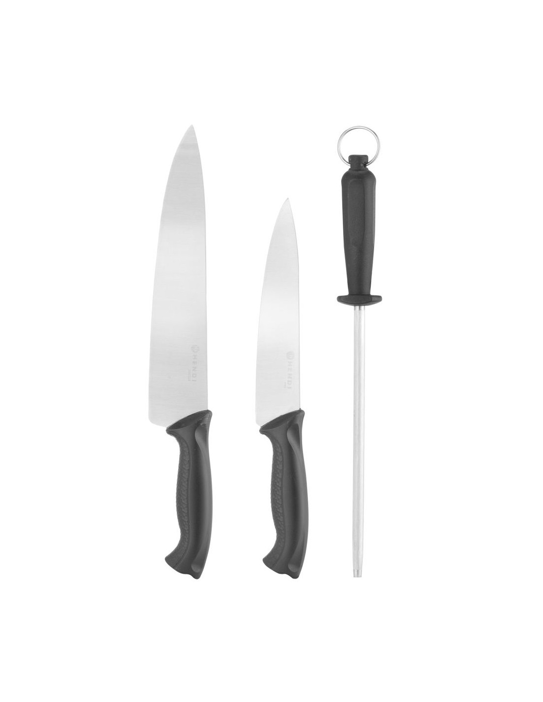 Inklusive 2 knivar och 1 slipverktyg. Knivblad av rostfritt stål, slipverktyg av kolstål. Handtag av PP. Tål maskindisk, endast för knivar. Setet innehåller: - 18 cm kockkniv (bladmått: 180x38 mm, handtag 140 mm, tjocklek 2,5 mm). - 24 cm kockkniv (bladmått: 240x50 mm, handtag 140 mm, tjocklek 2,5 mm). - 23 cm slipverktyg (stång/slipverktygsmått: 230x10 mm, handtag 125 mm).