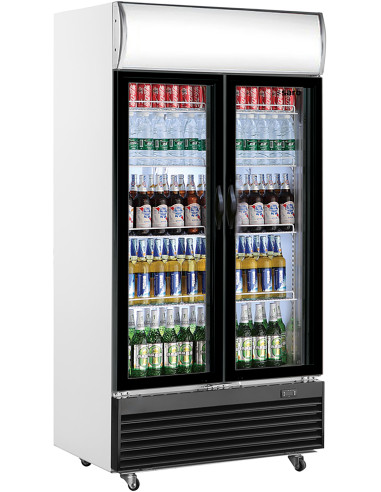 Material: (hölje) vit emalj; (invändigt) vit plast; (glasdörrkarm) svart plast