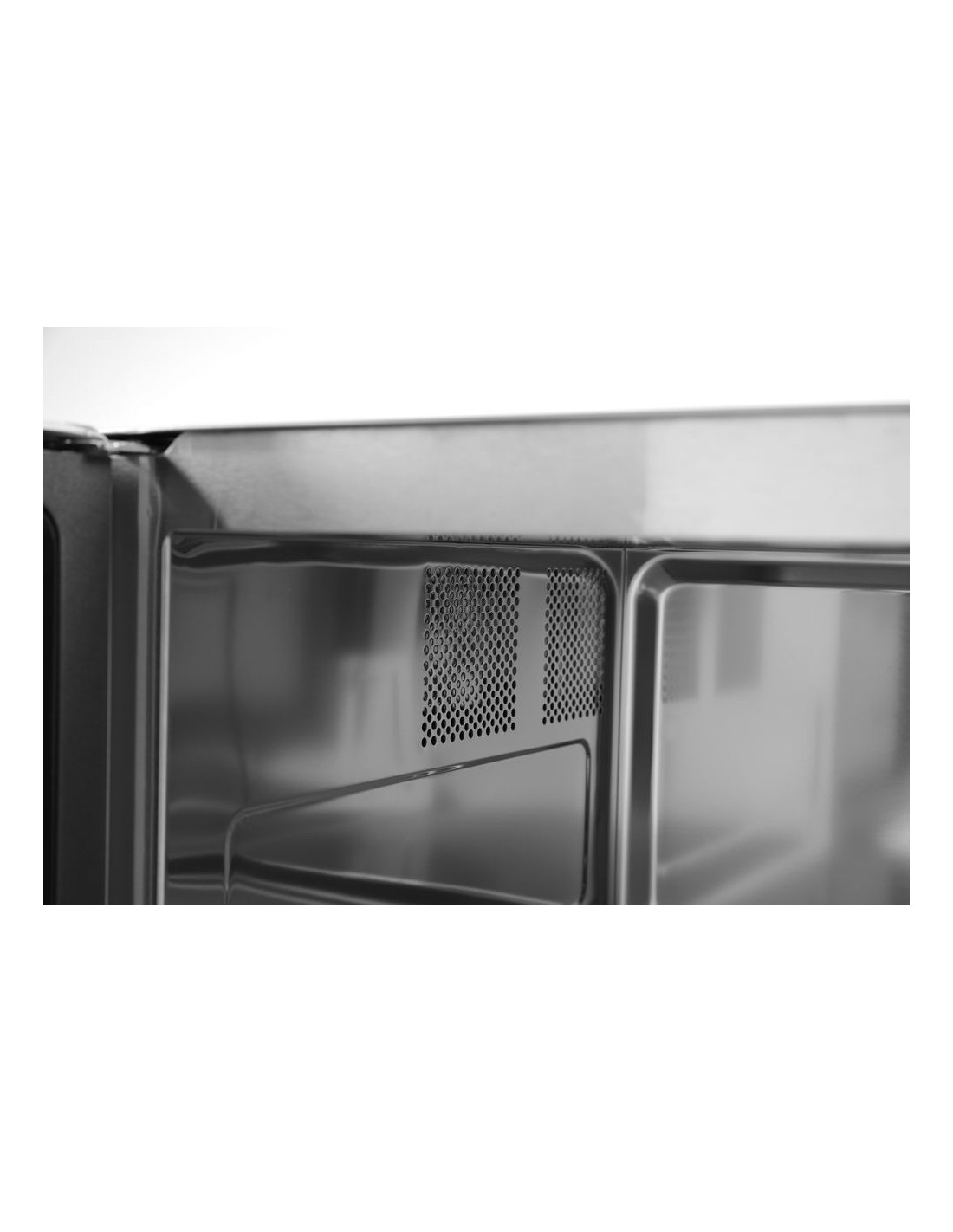 Hölje och insida av mikrovågsugnen med keramisk botten av rostfritt stål. Lättavläst kontrollpanel. Elektromekanisk kontroll med en knapp som justerar tiden från 15 s till 6 min. Nedre roterande magnetronantenn för jämn energifördelning, ingen roterande skiva. Inbyggt luftfilter som skydd mot yttre faktorer och damm. Dörr med stor glasruta för att observera processer i den upplysta mikrovågsugnens insida. Tät spärr; enkel öppning – ingen låsmekanism. Mikrovågsugnens insida: – mått 327x346x(H)200, kapacitet 25 l. – lätt att rengöra. – inga tallrikar går sönder tack vare avrundade kanter. – keramisk botten. Multifunktionell användning: – upptining. – 6 föreslagna tidsprogram för tillagning av utvalda rätter/drycker. – slutet av tillagningscykeln signaleras med ett akustiskt larm. Mikrovågseffekt: 1000 W. Lämplig för runda (upp till Ø320 mm) och rektangulära tallrikar. Maximal driftstid per gång: 6 minuter. Utrustad med kabel med jordad kontakt. Vikt: 15,1 kg.